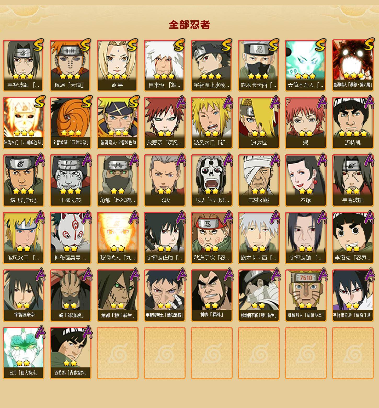 【S级忍者】:宇智波鼬「须佐能乎」(3星),宇智波止水「须佐能乎」(3星),旗木卡卡西「须佐能乎」(3星),自来也「舞之豪杰」(3星),纲手(3星),佩恩「天道」(3星),大筒木舍人「最终章」(3星),漩涡鸣人「暴怒·第六尾」(3星),波风水门「九喇嘛连结」(3星),宇智波斑「五影会谈」(3星),漩涡鸣人·宇智波佐助(3星)