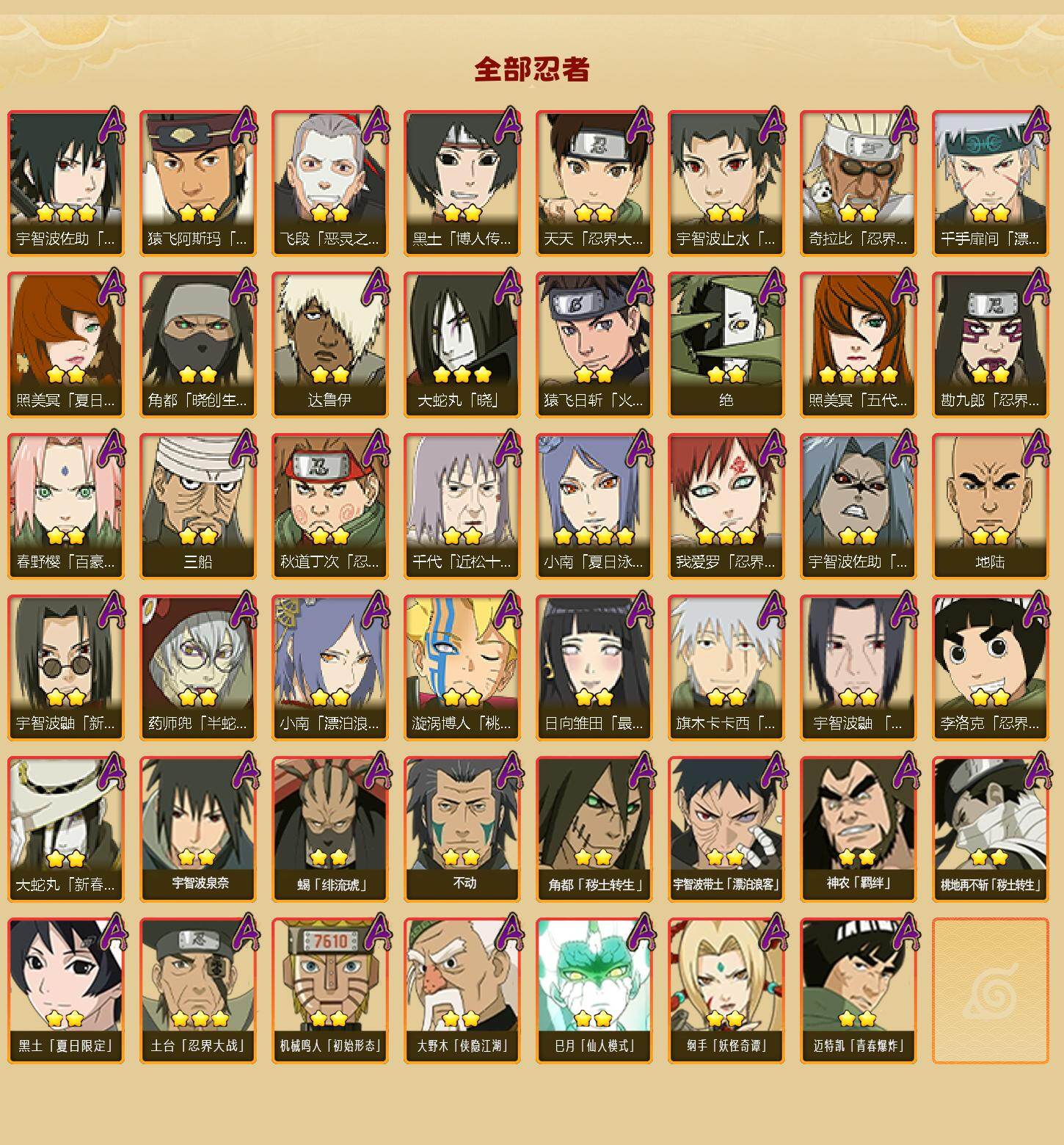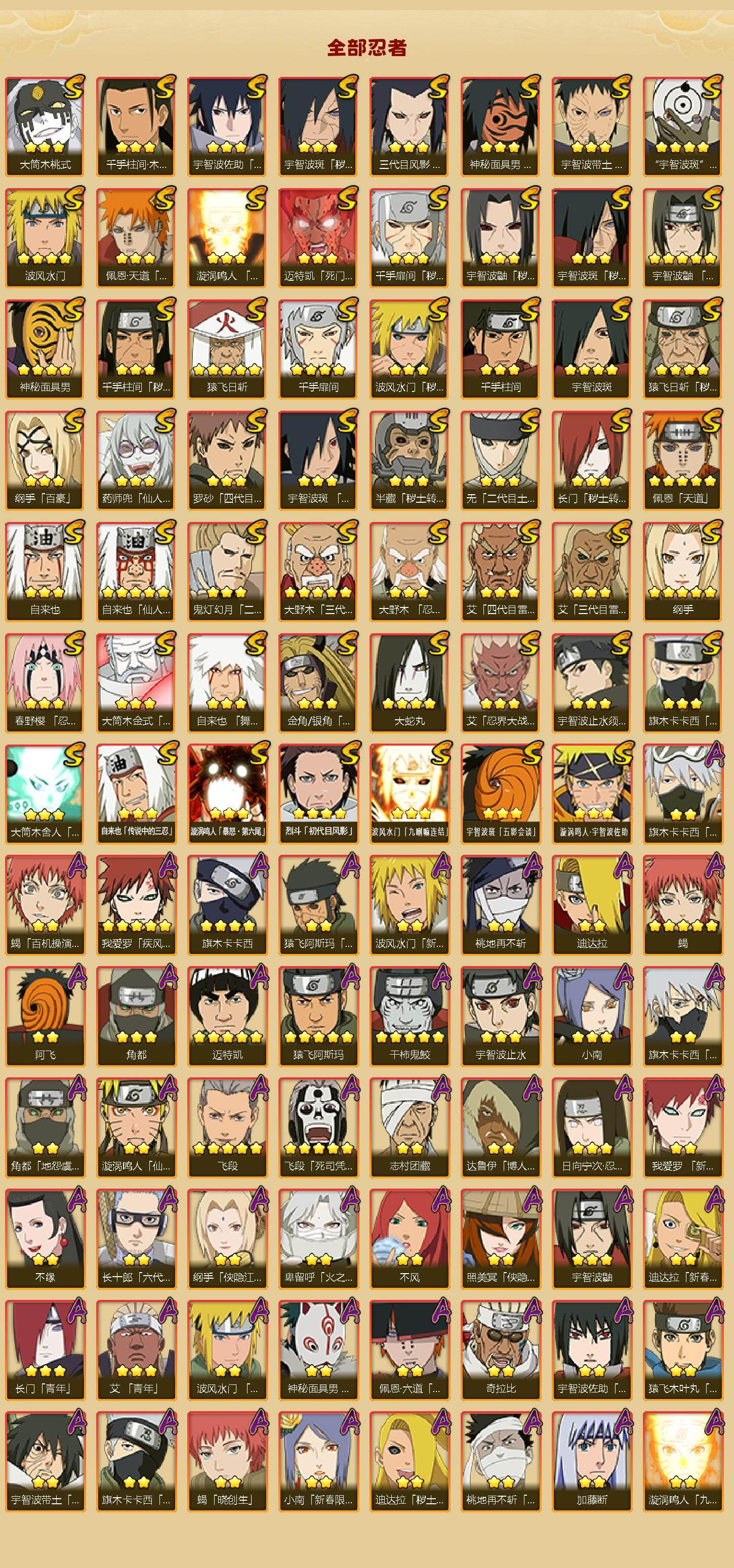 【S级忍者】:长门「秽土转生」(3星),三代目风影「秽土转生」(3星),半藏「秽土转生」(3星),金角·银角「秽土转生」(3星),猿飞日斩「秽土转生」(4星),波风水门「秽土转生」(3星),千手扉间「秽土转生」(3星),千手柱间「秽土转生」(3星),宇智波鼬「秽土转生」(3星),宇智波斑「秽土转生」(3星),宇智波斑「秽土转生·解」(3星),大野木「忍界大战」(3星),春野樱「忍界大战」(3星),宇智波带土「忍界大战」(3星),艾「忍界大战」(3星),宇智波鼬「须佐能乎」(5星),宇智波止水「须佐能乎」(3星),旗木卡卡西「须佐能乎」(3星),宇智波斑「木叶创立」(3星),千手柱间「木叶创立」(3星),无「二代目土影」(3星),艾「四代目雷影」(3星),罗砂「四代目风影」(3星),鬼灯幻月「二代目水影」(3星),大野木「三代目土影」(5星),艾「三代目雷影」(3星),烈斗「初代目风影」(4星),自来也(3星),自来也「仙人模式」(5星),自来也「舞之豪杰」(3星),大蛇丸(4星),自来也「传说中的三忍」(3星),纲手(5星),纲手「百豪」(3星),千手柱间(3星),千手扉间(4星),猿飞日斩(5星),宇智波斑(4星),波风水门(4星),药师兜「仙人模式」(3星),神秘面具男(4星),神秘面具男「红夜之刃」(3星),漩涡鸣人「九喇嘛连结」(3星),迈特凯「死门」(3星),佩恩「天道」(5星),佩恩·天道「超」(3星),宇智波佐助「永恒万花筒」(3星),宇智波斑 「白面具」(4星宇智波斑「白面具」),大筒木金式(3星),大筒木桃式(3星),大筒木舍人「最终章」(3星),漩涡鸣人「暴怒·第六尾」(3星),波风水门「九喇嘛连结」(3星),宇智波斑「五影会谈」(3星),漩涡鸣人·宇智波佐助(3星)