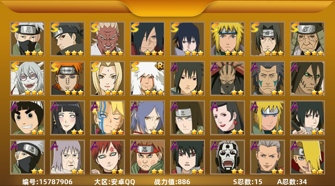 [15787906]15S级忍者数-34A级忍者数 【S级忍者】:猿飞日斩「秽土转生」(3星),宇智波斑「秽土转生·解」(3星),艾「忍界大战」(3星),宇智波鼬「须佐能乎」(3星),宇智波止水「须佐能乎」(3星),旗木卡卡西「须佐能乎」(3星),自来也「舞之豪杰」(3星),自来也「传说中的三忍」(3星),纲手(3星),波风水门(3星),药师兜「仙人模式」(3星),佩恩「天道」(3星),宇智波佐助「永恒万花筒」(3星),波风水门「九喇嘛连结」(3星),漩涡鸣人·宇智波佐助(3星) 【A级忍者】:波风水门「青年」(2星),迪达拉(2星),飞段(2星),飞段「死司凭血」(2星),干柿鬼鲛(5星),漩涡博人「桃式显现」(2星),机械鸣人「初始形态」(2星),迈特凯(5星),旗木卡卡西「忍界大战」(2星),桃地再不斩「秽土转生」(2星),我爱罗「疾风传」(3星),我爱罗「忍界大战」(2星),蝎(3星),蝎「绯流琥」(2星),小南「漂泊浪客」(2星),角都「秽土转生」(2星),猿飞阿斯玛(5星),宇智波鼬(2星),宇智波佐助「须佐能乎」(2星),宇智波佐助「万花筒写轮眼」(2星),日向宁次「忍界大战」(2星),日向雏田「最终章」(2星),李洛克「忍界大战」(2星),黑土「博人传」(2星),秋道丁次「忍界大战」(2星),千代「近松十人卫」(2星),神农「羁绊」(2星),土台「忍界大战」(2星),不缘(2星),宇智波泉奈(2星),不动(2星),大野木「侠隐江湖」(2星),巳月「仙人模式」(2星),迈特凯「青春爆炸」(2星)