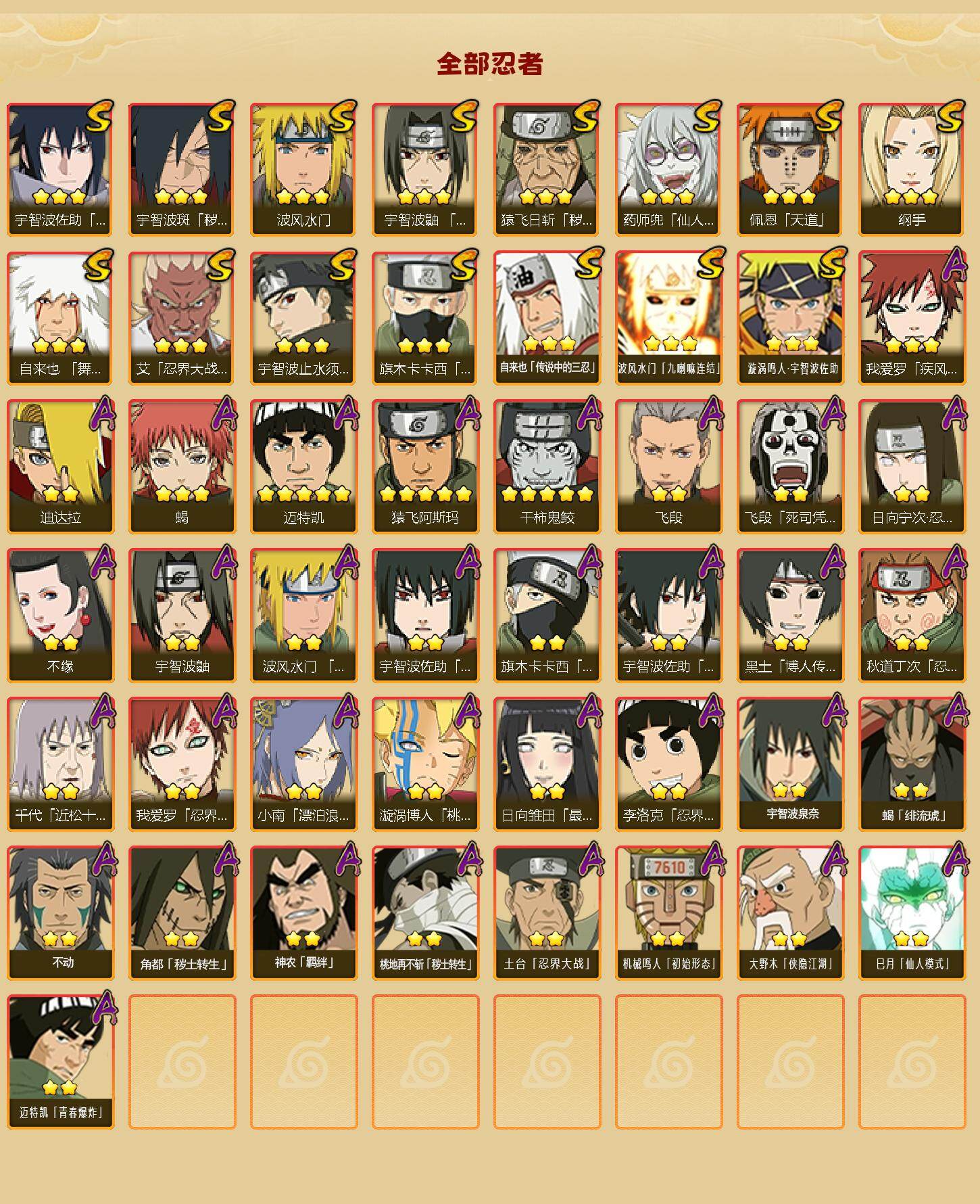 【A级忍者】:波风水门「青年」(2星),迪达拉(2星),飞段(2星),飞段「死司凭血」(2星),干柿鬼鲛(5星),漩涡博人「桃式显现」(2星),机械鸣人「初始形态」(2星),迈特凯(5星),旗木卡卡西「忍界大战」(2星),桃地再不斩「秽土转生」(2星),我爱罗「疾风传」(3星),我爱罗「忍界大战」(2星),蝎(3星),蝎「绯流琥」(2星),小南「漂泊浪客」(2星),角都「秽土转生」(2星),猿飞阿斯玛(5星),宇智波鼬(2星),宇智波佐助「须佐能乎」(2星),宇智波佐助「万花筒写轮眼」(2星),日向宁次「忍界大战」(2星),日向雏田「最终章」(2星),李洛克「忍界大战」(2星),黑土「博人传」(2星),秋道丁次「忍界大战」(2星),千代「近松十人卫」(2星),神农「羁绊」(2星),土台「忍界大战」(2星),不缘(2星),宇智波泉奈(2星),不动(2星),大野木「侠隐江湖」(2星),巳月「仙人模式」(2星),迈特凯「青春爆炸」(2星)