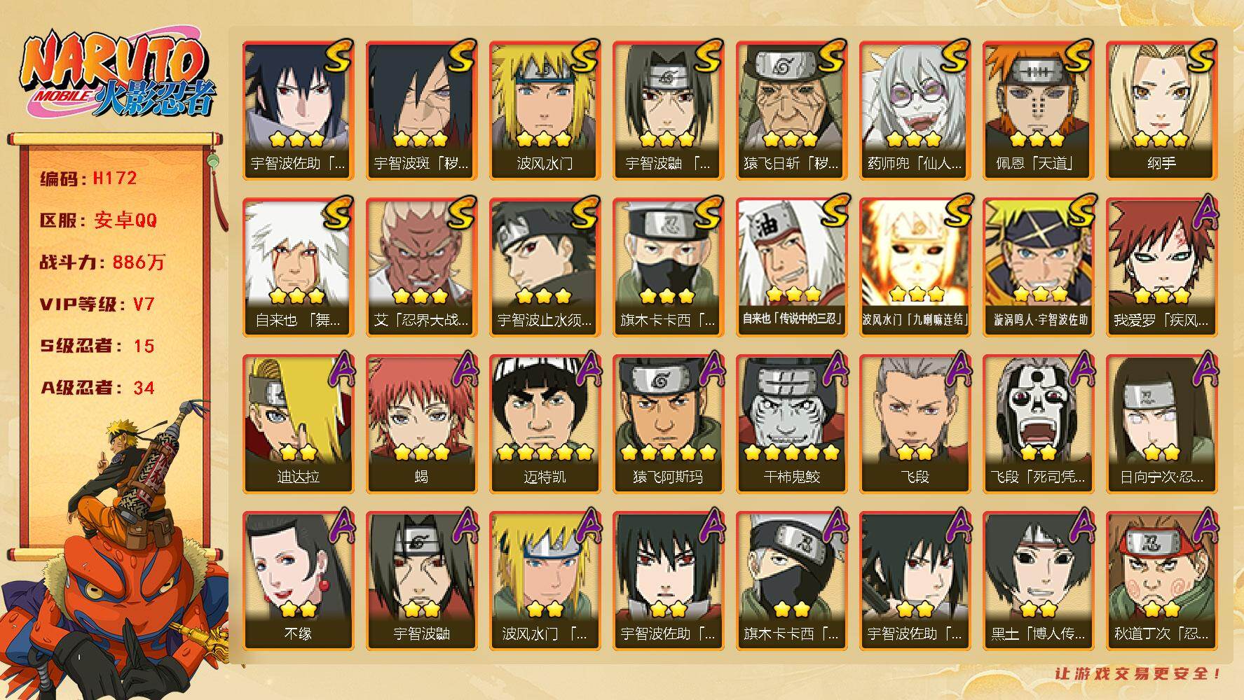 【S级忍者】:猿飞日斩「秽土转生」(3星),宇智波斑「秽土转生·解」(3星),艾「忍界大战」(3星),宇智波鼬「须佐能乎」(3星),宇智波止水「须佐能乎」(3星),旗木卡卡西「须佐能乎」(3星),自来也「舞之豪杰」(3星),自来也「传说中的三忍」(3星),纲手(3星),波风水门(3星),药师兜「仙人模式」(3星),佩恩「天道」(3星),宇智波佐助「永恒万花筒」(3星),波风水门「九喇嘛连结」(3星),漩涡鸣人·宇智波佐助(3星)