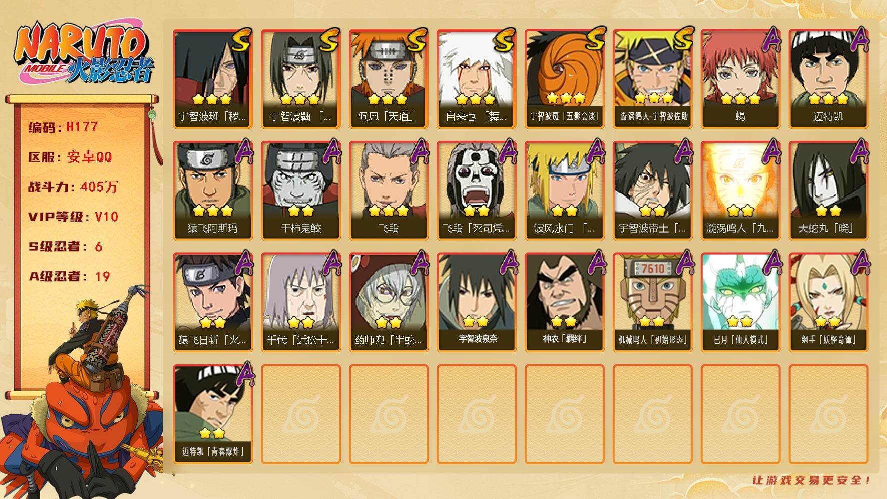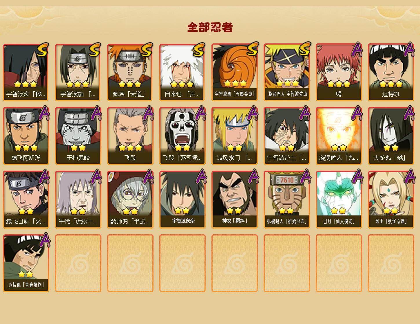 【S级忍者】:宇智波斑「秽土转生」(3星),宇智波鼬「须佐能乎」(3星),自来也「舞之豪杰」(3星),佩恩「天道」(3星),宇智波斑「五影会谈」(3星),漩涡鸣人·宇智波佐助(3星)