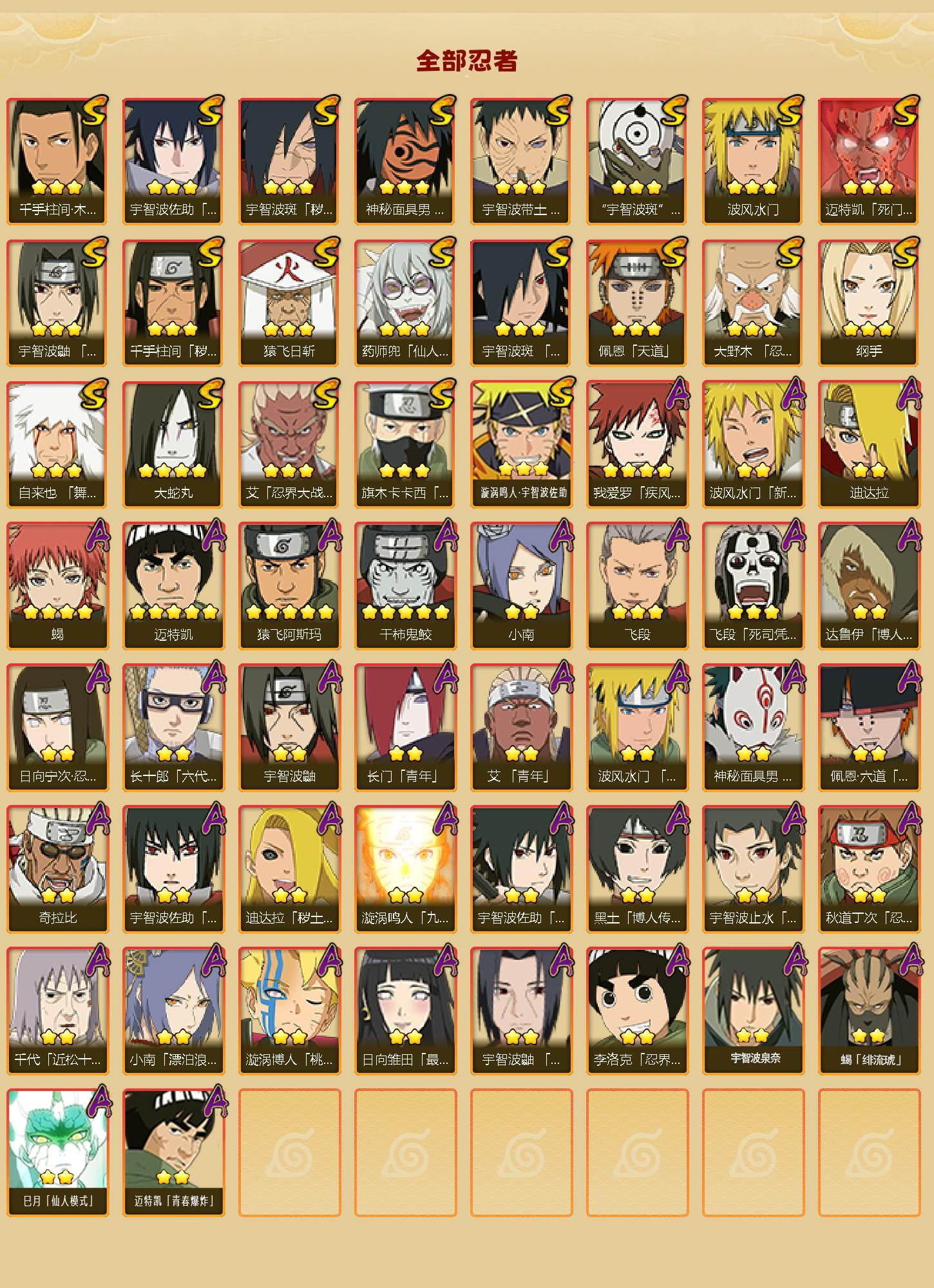 【S级忍者】:千手柱间「秽土转生」(3星),宇智波斑「秽土转生·解」(3星),大野木「忍界大战」(3星),宇智波带土「忍界大战」(3星),艾「忍界大战」(3星),宇智波鼬「须佐能乎」(3星),旗木卡卡西「须佐能乎」(3星),宇智波斑「木叶创立」(3星),千手柱间「木叶创立」(3星),自来也「舞之豪杰」(3星),大蛇丸(4星),纲手(3星),猿飞日斩(3星),波风水门(3星),药师兜「仙人模式」(3星),神秘面具男「红夜之刃」(3星),迈特凯「死门」(3星),佩恩「天道」(3星),宇智波佐助「永恒万花筒」(3星),宇智波斑 「白面具」(3星宇智波斑「白面具」),漩涡鸣人·宇智波佐助(3星)