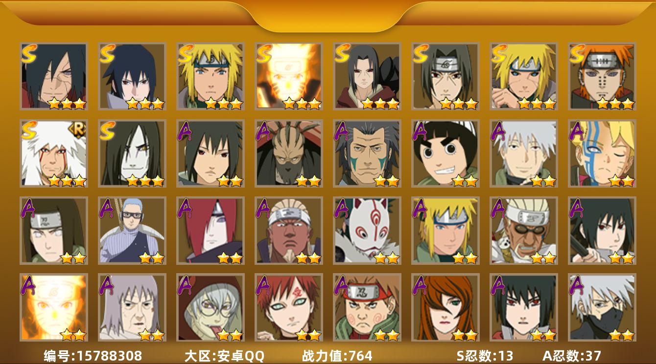 [15788308]13S级忍者数-37A级忍者数 【S级忍者】:波风水门「秽土转生」(3星),宇智波鼬「秽土转生」(3星),宇智波斑「秽土转生·解」(3星),宇智波鼬「须佐能乎」(3星),自来也「舞之豪杰」(3星),大蛇丸(3星),自来也「传说中的三忍」(3星),波风水门(3星),漩涡鸣人「九喇嘛连结」(3星),佩恩「天道」(3星),宇智波佐助「永恒万花筒」(3星),波风水门「九喇嘛连结」(3星),漩涡鸣人·宇智波佐助(3星) 【A级忍者】:艾「青年」(2星),长门「青年」(2星),波风水门「青年」(2星),迪达拉(2星),奇拉比「忍界大战」(2星),飞段(4星),飞段「死司凭血」(3星),干柿鬼鲛(4星),漩涡博人「桃式显现」(2星),漩涡鸣人「九尾查克拉」(2星),机械鸣人「初始形态」(2星),迈特凯(4星),旗木卡卡西「万花筒写轮眼」(2星),旗木卡卡西「幻之真容」(2星),桃地再不斩「秽土转生」(2星),我爱罗「疾风传」(3星),我爱罗「忍界大战」(2星),蝎(2星),蝎「绯流琥」(2星),猿飞阿斯玛(2星),宇智波佐助「须佐能乎」(2星),宇智波佐助「万花筒写轮眼」(2星),药师兜「半蛇斗篷」(2星),照美冥「五代目水影」(2星),日向宁次「忍界大战」(2星),长十郎「六代目水影」(2星),神秘面具男「忍者之路」(2星),李洛克「忍界大战」(2星),黑土「博人传」(2星),秋道丁次「忍界大战」(2星),千代「近松十人卫」(2星),土台「忍界大战」(2星),宇智波泉奈(2星),不动(2星),大野木「侠隐江湖」(2星),巳月「仙人模式」(2星),迈特凯「青春爆炸」(2星)