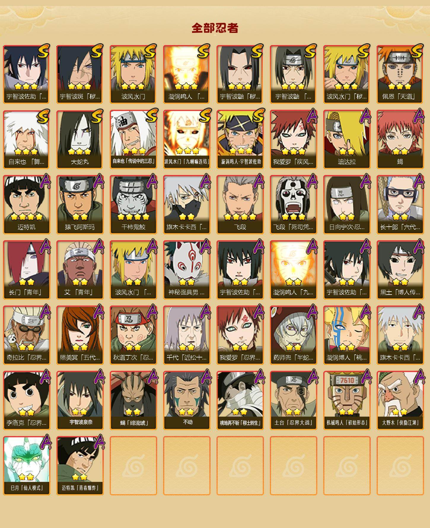 【A级忍者】:艾「青年」(2星),长门「青年」(2星),波风水门「青年」(2星),迪达拉(2星),奇拉比「忍界大战」(2星),飞段(4星),飞段「死司凭血」(3星),干柿鬼鲛(4星),漩涡博人「桃式显现」(2星),漩涡鸣人「九尾查克拉」(2星),机械鸣人「初始形态」(2星),迈特凯(4星),旗木卡卡西「万花筒写轮眼」(2星),旗木卡卡西「幻之真容」(2星),桃地再不斩「秽土转生」(2星),我爱罗「疾风传」(3星),我爱罗「忍界大战」(2星),蝎(2星),蝎「绯流琥」(2星),猿飞阿斯玛(2星),宇智波佐助「须佐能乎」(2星),宇智波佐助「万花筒写轮眼」(2星),药师兜「半蛇斗篷」(2星),照美冥「五代目水影」(2星),日向宁次「忍界大战」(2星),长十郎「六代目水影」(2星),神秘面具男「忍者之路」(2星),李洛克「忍界大战」(2星),黑土「博人传」(2星),秋道丁次「忍界大战」(2星),千代「近松十人卫」(2星),土台「忍界大战」(2星),宇智波泉奈(2星),不动(2星),大野木「侠隐江湖」(2星),巳月「仙人模式」(2星),迈特凯「青春爆炸」(2星)