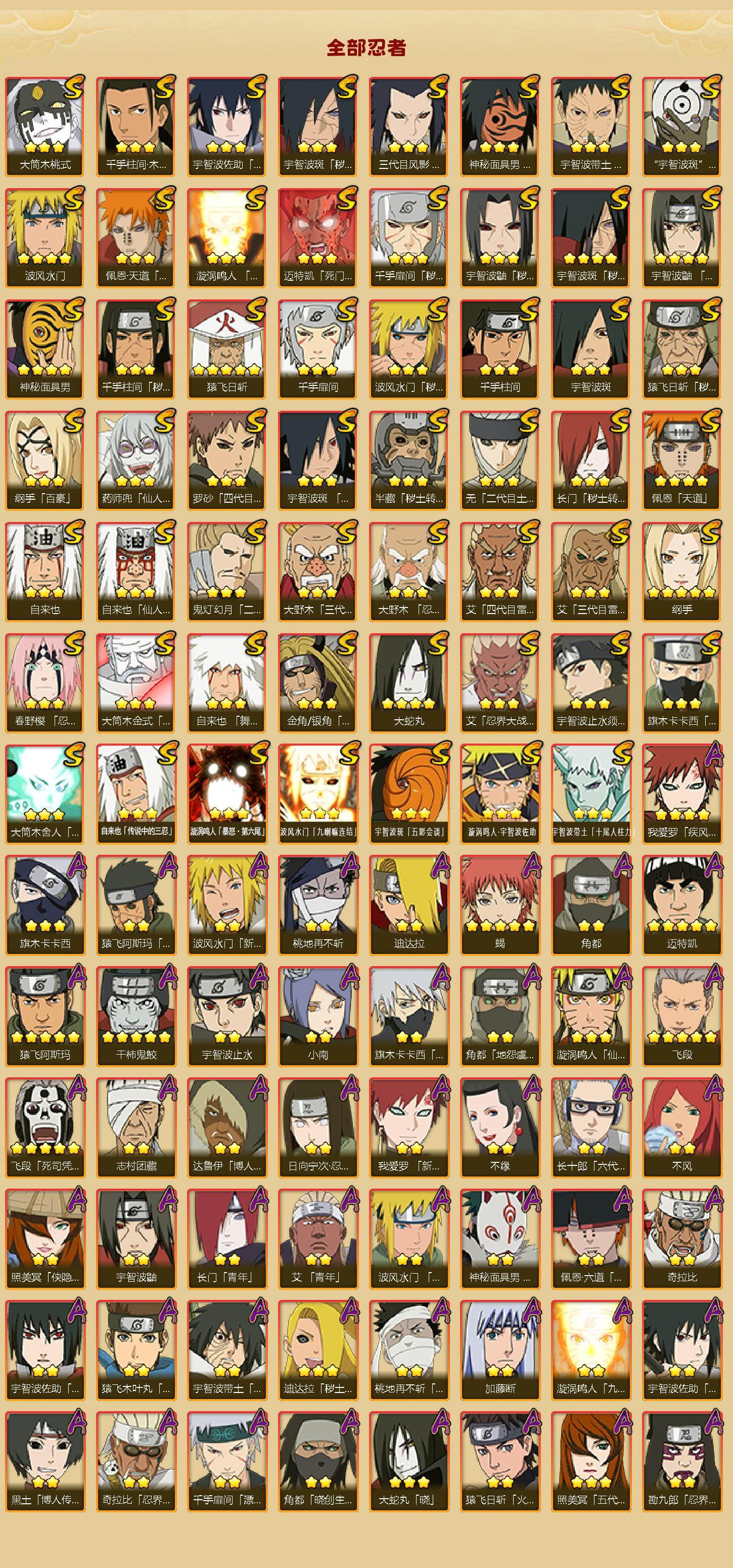 【S级忍者】:长门「秽土转生」(3星),三代目风影「秽土转生」(3星),半藏「秽土转生」(3星),金角·银角「秽土转生」(3星),猿飞日斩「秽土转生」(3星),波风水门「秽土转生」(3星),千手扉间「秽土转生」(3星),千手柱间「秽土转生」(3星),宇智波鼬「秽土转生」(3星),宇智波斑「秽土转生」(4星),宇智波斑「秽土转生·解」(3星),大野木「忍界大战」(3星),春野樱「忍界大战」(3星),宇智波带土「忍界大战」(3星),艾「忍界大战」(3星),宇智波鼬「须佐能乎」(4星),宇智波止水「须佐能乎」(3星),旗木卡卡西「须佐能乎」(3星),宇智波斑「木叶创立」(3星),千手柱间「木叶创立」(3星),无「二代目土影」(3星),艾「四代目雷影」(3星),罗砂「四代目风影」(3星),鬼灯幻月「二代目水影」(3星),大野木「三代目土影」(3星),艾「三代目雷影」(3星),自来也(3星),自来也「仙人模式」(3星),自来也「舞之豪杰」(3星),大蛇丸(4星),自来也「传说中的三忍」(3星),纲手(5星),纲手「百豪」(3星),千手柱间(3星),千手扉间(3星),猿飞日斩(5星),宇智波斑(3星),波风水门(4星),药师兜「仙人模式」(3星),神秘面具男(4星),神秘面具男「红夜之刃」(3星),漩涡鸣人「九喇嘛连结」(3星),迈特凯「死门」(3星),佩恩「天道」(4星),佩恩·天道「超」(3星),宇智波佐助「永恒万花筒」(3星),宇智波斑 「白面具」(3星宇智波斑「白面具」),大筒木金式(3星),大筒木桃式(3星),大筒木舍人「最终章」(3星),漩涡鸣人「暴怒·第六尾」(3星),波风水门「九喇嘛连结」(3星),宇智波斑「五影会谈」(3星),漩涡鸣人·宇智波佐助(3星),宇智波带土「十尾人柱力」(3星)