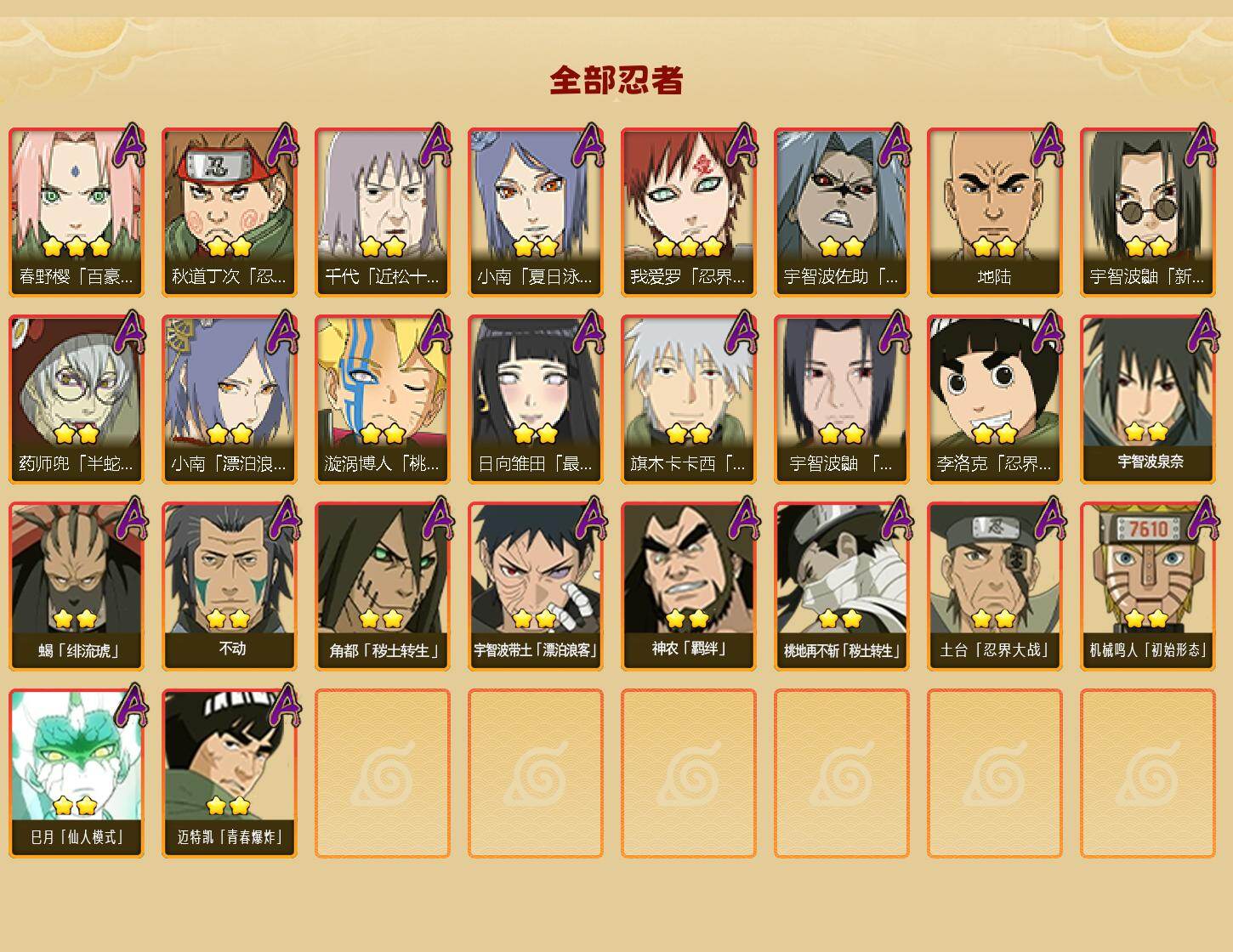 【A级忍者】:艾「青年」(2星),长门「青年」(2星),波风水门「青年」(2星),波风水门「新春限定」(2星),达鲁伊「博人传」(2星),迪达拉(2星),迪达拉「秽土转生」(3星),大蛇丸「晓」(3星),奇拉比(2星),奇拉比「忍界大战」(2星),飞段(5星),飞段「死司凭血」(5星),干柿鬼鲛(5星),漩涡博人「桃式显现」(2星),漩涡鸣人「仙人模式」(3星),漩涡鸣人「九尾查克拉」(2星),机械鸣人「初始形态」(2星),迈特凯(5星),旗
