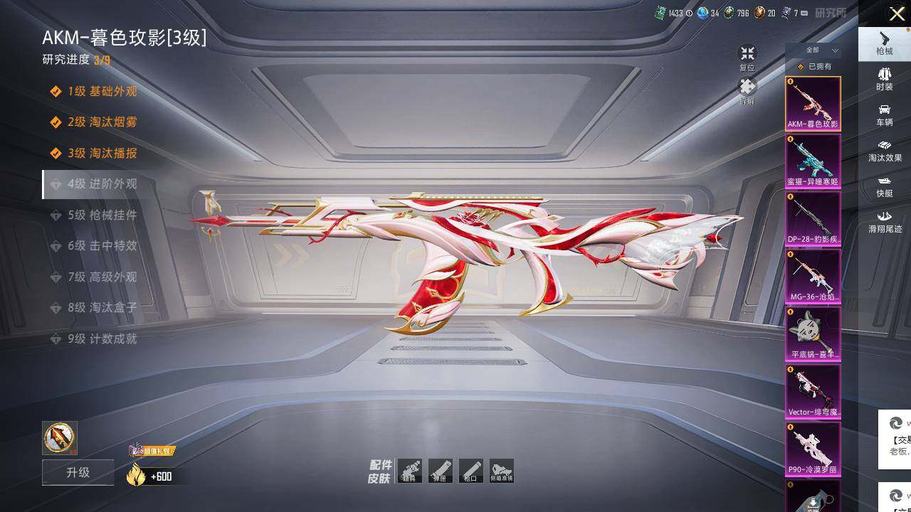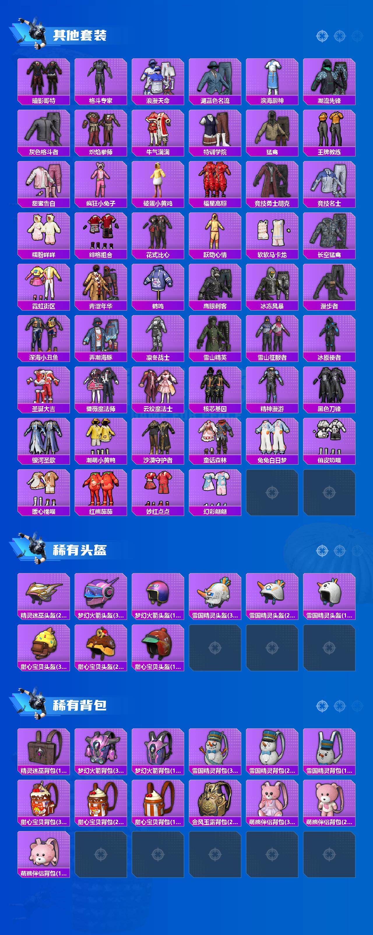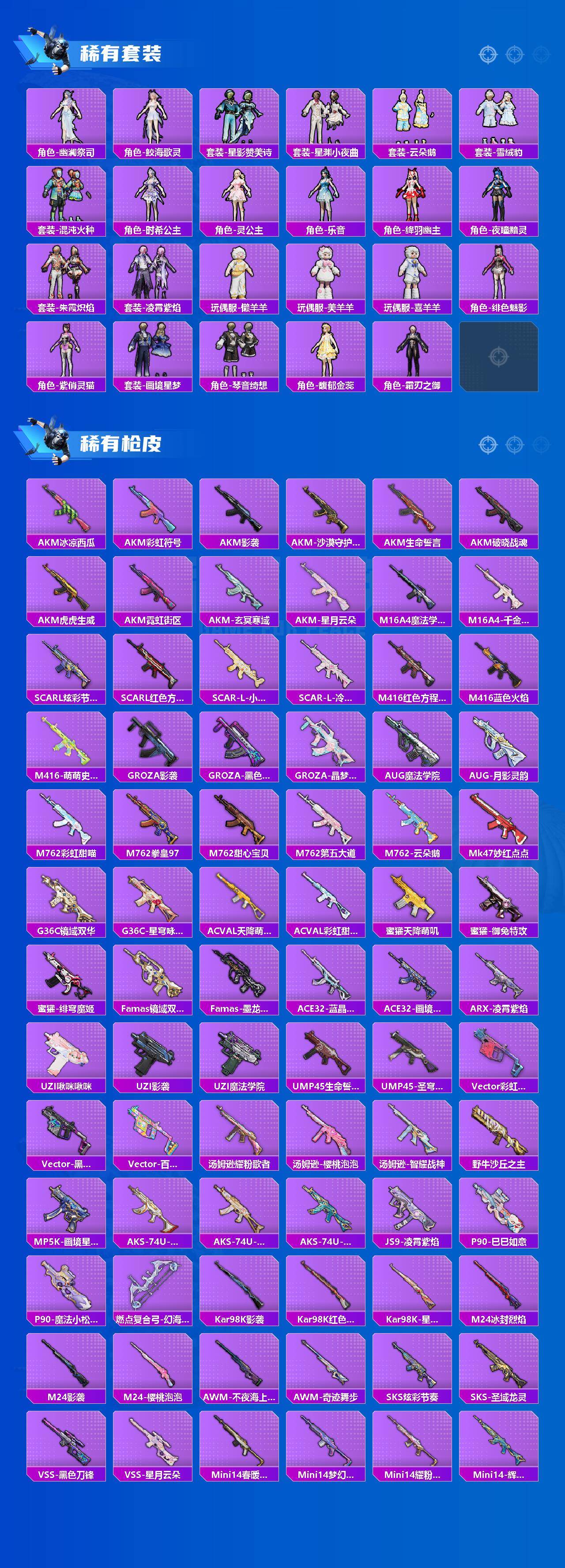 【粉色枪皮等级】:AKM-幻海仙踪(五级),AKM-暮色玫影(三级),M416-墨龙九天(三级),GROZA-镜光银凌(五级),AUG-暖羊咩咩(五级),M762-鬼刀(五级),蜜獾-异瞳寒姬(三级),Vector-绯穹魔姬(三级),AKS-74U-星穹咏叹调(三级),P90-冷漠罗丽(五级),Kar98K-巳巳如意(一级),M24-镜域双华(一级),AMR-智耀战神(五级),MK12-雪月幻音(一级),M249-彩虹甜喵(一级),DP-28-千金淑猫(七级),DP-28-豹影疾电(五级),MG3-辉羽雀灵(二级),MG-36-沧焰双生(五级),平底锅-喜羊羊与灰太狼(五级),烟雾弹-甜梦果泡(五级),破片手榴弹-热量炸弹(七级),破片手榴弹-瓶中星球(六级)