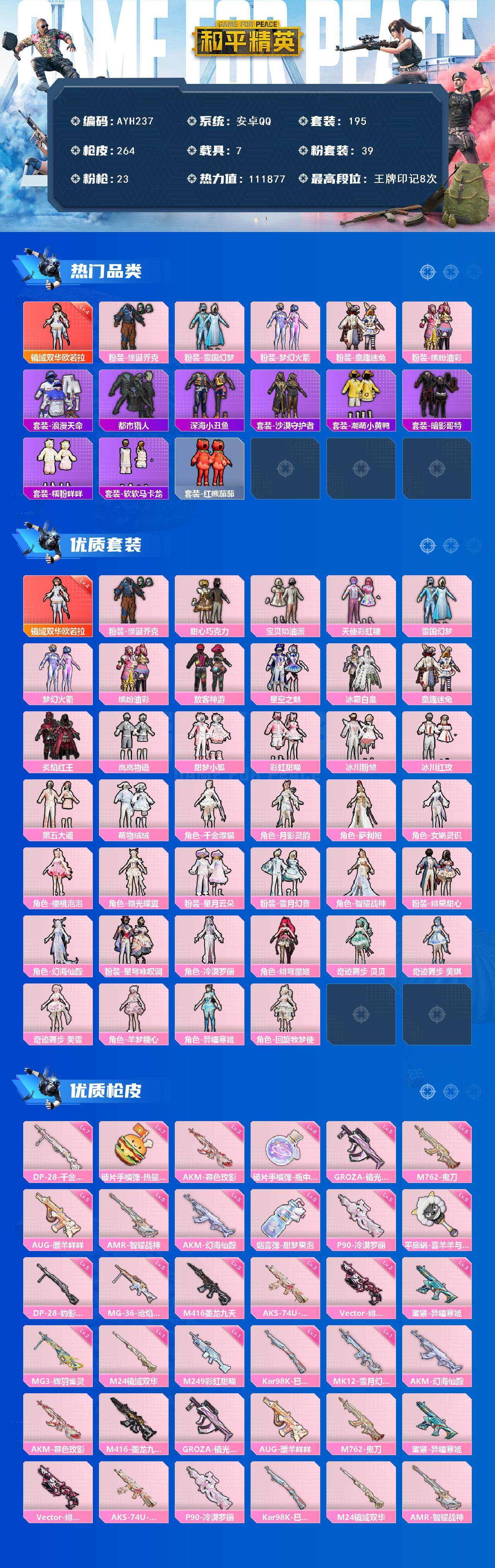 [15789054]【特价出售/店主推荐】安卓 手Q-1神装-39粉装-23特效枪-7载具-14粉色飞行器-111877热力值-8王牌印记-195套装-264枪皮