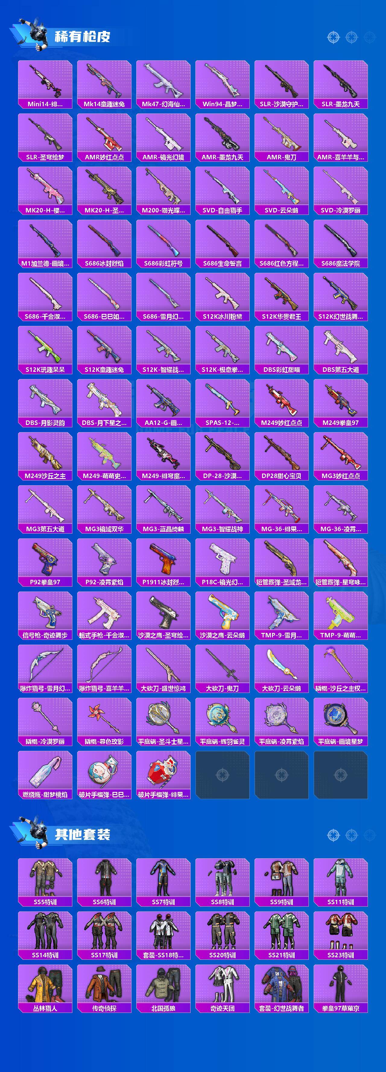- [16671621]【店主推荐捡漏号!可直接换绑】46180k哈伏币-201m流动资产-60烽火等级-钻石-27战场等级-上等兵 【干员外观】:蜂医-送葬人·无题密令,深蓝-不破誓约,红狼-电锯惊魂 【近战皮肤】:近战-信条,近战-黑鹰 【传说外观】:M4A1突击步枪-蚀金玫瑰,M4A1突击步枪-阿米娅,ASh-12战斗步枪-鹅鸭杀,SG552突击步枪-运动员,AK-12突击步枪-特斯拉线圈,SCAR-H战斗步枪-启航,G3战斗步枪-骑士,CAR-15突击步枪-阿米娅,腾龙突击步枪-捞点薯条,KC17突击步枪-电锯惊魂,P90冲锋枪-信条,UZI冲锋枪-特斯拉线圈,SR-3M紧凑突击步枪-特斯拉线圈,勇士冲锋枪-能天使-午夜邮差,QCQ171冲锋枪-鹅鸭杀,725双管霰弹枪-送葬人-无题密令,M250通用机枪-骑士之心,QJB201轻机枪-鹅鸭杀,SR-25射手步枪-信条,R93狙击步枪-维什戴尔,AWM狙击步枪-捞点薯条,93R-捞点薯条,复合弓-黑·天际线 【史诗外观】:ASh-12战斗步枪-无极限,M16A4突击步枪-竞赛选手,AUG突击步枪-蝮蛇,G3战斗步枪-流沙送葬,AS Val突击步枪-典狱官,AS Val突击步枪-百步穿杨,腾龙突击步枪-无垢,腾龙突击步枪-猎鳄行动,K437突击步枪-守护者,MP5冲锋枪-深海恐惧,MP5冲锋枪-战术竞备,MP5冲锋枪-竞技风,Vector冲锋枪-阿萨拉文明,Vector冲锋枪-异域战争,SR-3M紧凑突击步枪-荒野求生,SR-3M紧凑突击步枪-战术竞备,勇士冲锋枪-工业狂潮,MP7冲锋枪-无垢,MP7冲锋枪-守护者,PKM通用机枪-荒野求生,M250通用机枪-囚徒,Mini-14射手步枪-守护者,SVD狙击步枪-荒野求生,PSG-1射手步枪-无垢,SV-98狙击步枪-林中猎手,SV-98狙击步枪-囚徒,M700狙击步枪-竞技风,M700狙击步枪-蝮蛇,M700狙击步枪-百步穿杨,AWM狙击步枪-无极限,复合弓-守护者 【稀有外观】:M4A1突击步枪-零点,M4A1突击步枪-繁盛,AKM突击步枪-战术演练,AKM突击步枪-肃杀,QBZ95-1突击步枪-公平竞技,ASh-12战斗步枪-繁盛,K416突击步枪-碳纤维,K416突击步枪-虎啸,M16A4突击步枪-街头涂鸦,M7战斗步枪-捣蛋鬼,AK-12突击步枪-零点,SCAR-H战斗步枪