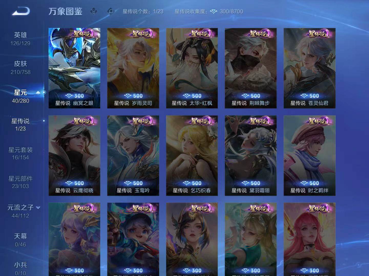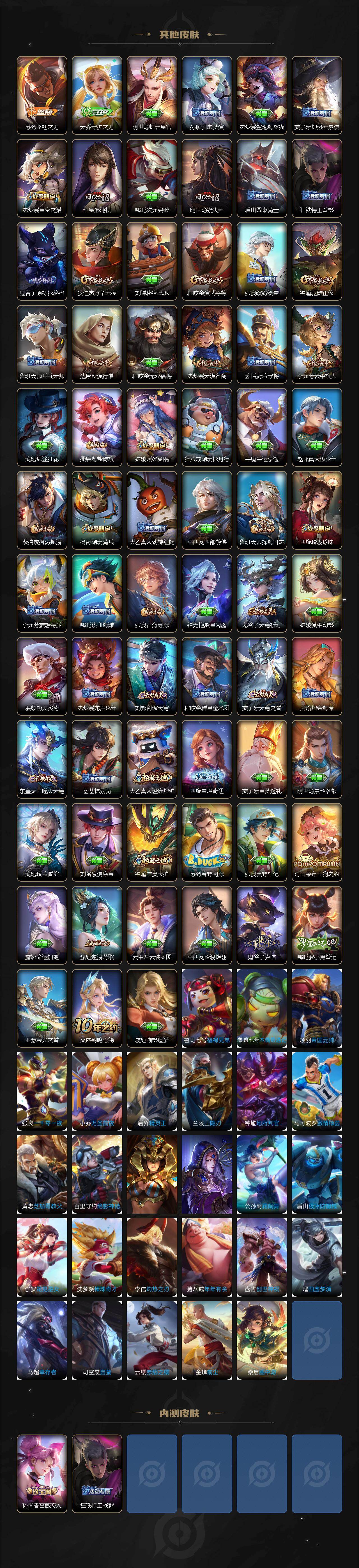 【限定皮肤】:姜子牙天穹之誓,狄仁杰阴阳师,赵云皇家上将,孙尚香蔷薇恋人,庄周高山流水,扁鹊奇幻香踪,元歌无心,马可波罗妄想实况,狄仁杰魔术师,狄仁杰万华元夜,达摩沙漠行僧,项羽海滩派对,程咬金演武夺筹,孙悟空至尊宝,孙悟空齐天大圣,李元芳银河之约,李元芳云中旅人,钟馗驱傩正仪,杨戬潮玩骑兵,鬼谷子原初探秘者,鬼谷子五谷丰年,诸葛亮鹤羽星尊,百里玄策原初追逐者,弈星混沌棋,沈梦溪星空之诺,沈梦溪大漠名商,明世隐疑决卦,裴擒虎李小龙,裴擒虎擒涛扼浪,嫦娥暖冬兔眠,曜山海苍雷引,西施玲珑珍味,鲁班大师探海日志,桑启海盐诗旅,暃星界游侠,戈娅驭风魔法,阿古朵江河有灵,张良古海寻踪,蒙犽百解令,鬼谷子天穹祈灯,伽罗琥珀纪元,姬小满妄想食味,沈梦溪龙舞盛年,刘邦剑破天穹,程咬金群星魔术团,周瑜熔金海岸