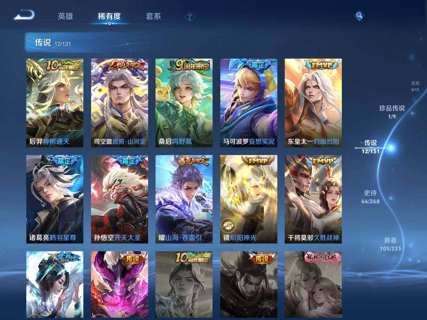 【传说皮肤】:后羿神树通天,司空震愿照山河定,桑启鸣野蒿,马可波罗妄想实况,东皇太一灼幽烈阳,诸葛亮鹤羽星尊,孙悟空齐天大圣,曜山海苍雷引,镜炽阳神光,干将莫邪久胜战神,虞姬云霓雀翎,宫本武藏地狱之眼