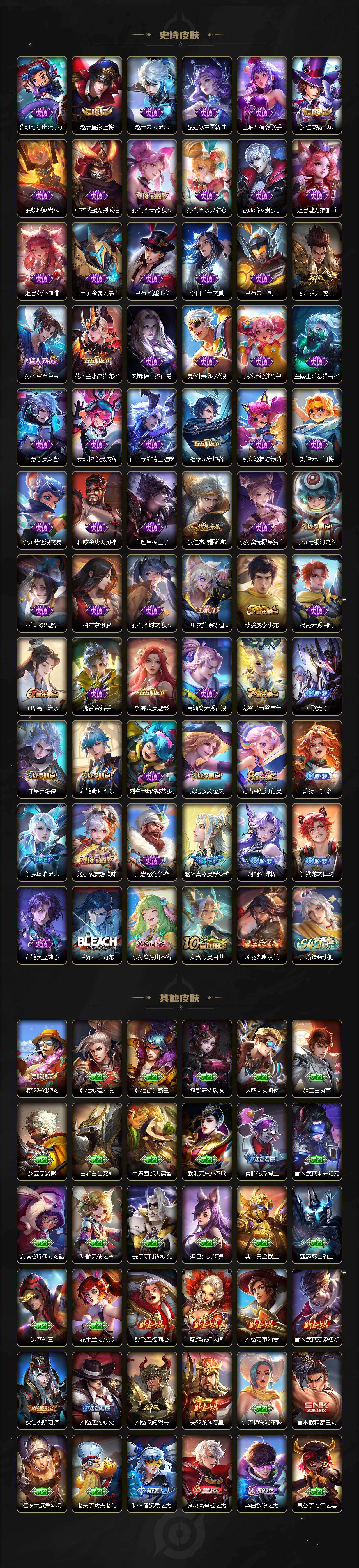 【史诗皮肤】:鲁班七号电玩小子,赵云皇家上将,赵云未来纪元,甄姬冰雪圆舞曲,王昭君偶像歌手,狄仁杰魔术师,廉颇地狱岩魂,宫本武藏鬼剑武藏,孙尚香蔷薇恋人,孙尚香水果甜心,嬴政暗夜贵公子,妲己魅力维加斯,妲己女仆咖啡,墨子金属风暴,吕布圣诞狂欢,李白千年之狐,吕布末日机甲,张飞乱世虎臣,孙悟空至尊宝,花木兰水晶猎龙者,刘邦德古拉伯爵,夏侯惇乘风破浪,小乔缤纷独角兽,兰陵王暗隐猎兽者,亚瑟心灵战警,安琪拉心灵骇客,百里守约特工魅影,铠曙光守护者,蔡文姬舞动绿茵,刘禅天才门将,李元芳逐浪之夏,程咬金功夫厨神,白起星夜
