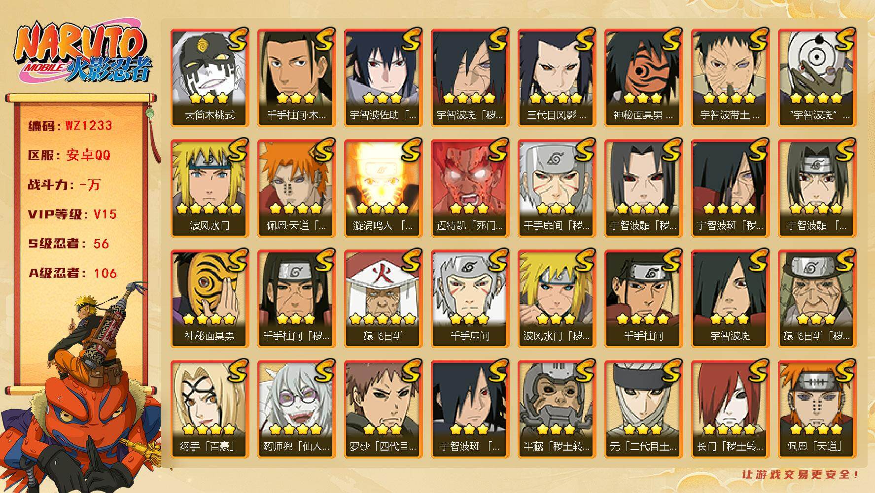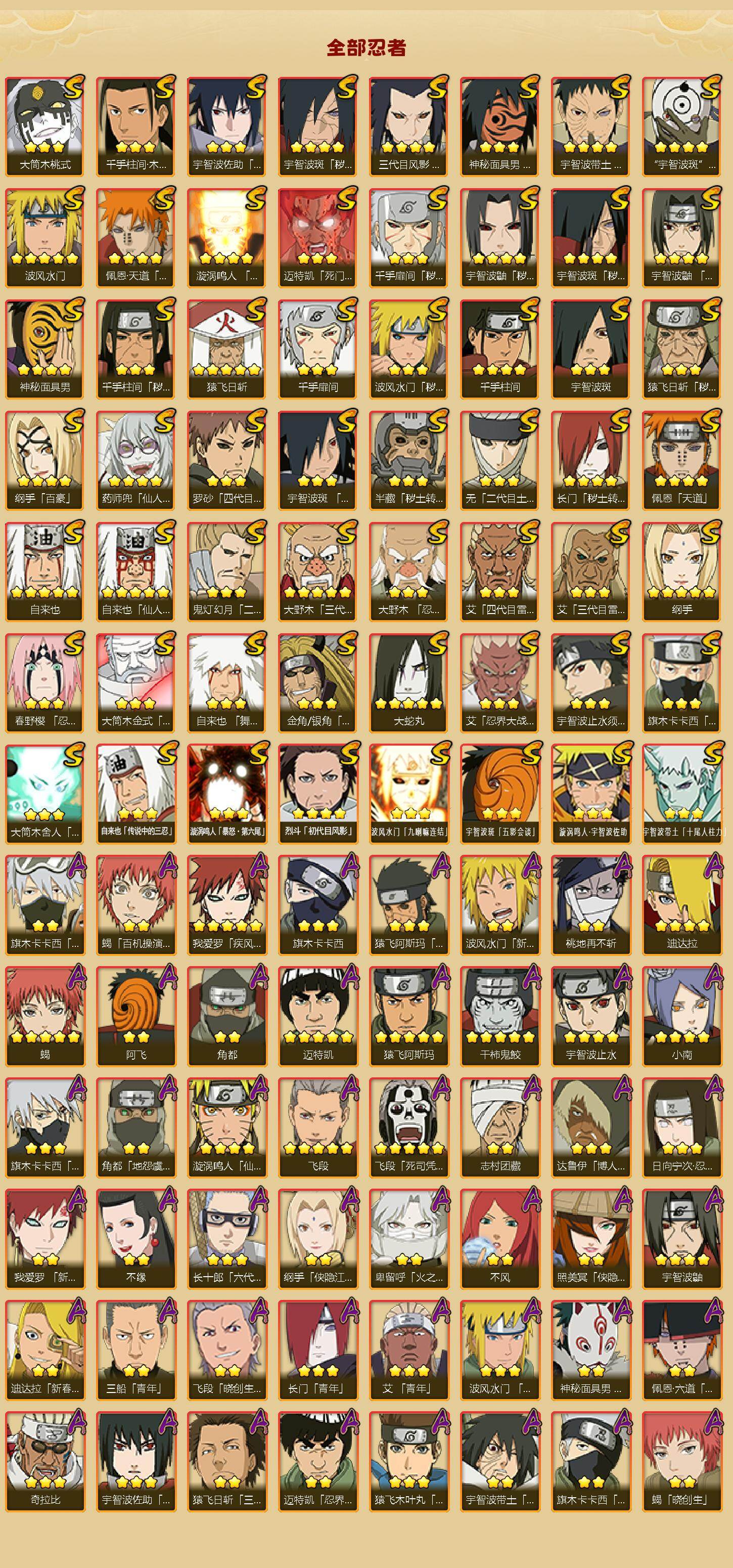【S级忍者】:长门「秽土转生」(4星),三代目风影「秽土转生」(4星),半藏「秽土转生」(3星),金角·银角「秽土转生」(3星),猿飞日斩「秽土转生」(3星),波风水门「秽土转生」(3星),千手扉间「秽土转生」(3星),千手柱间「秽土转生」(3星),宇智波鼬「秽土转生」(4星),宇智波斑「秽土转生」(4星),宇智波斑「秽土转生·解」(4星),大野木「忍界大战」(3星),春野樱「忍界大战」(3星),宇智波带土「忍界大战」(4星),艾「忍界大战」(3星),宇智波鼬「须佐能乎」(4星),宇智波止水「须佐能乎」(3星),旗木卡卡西「须佐能乎」(3星),宇智波斑「木叶创立」(3星),千手柱间「木叶创立」(3星),无「二代目土影」(3星),艾「四代目雷影」(3星),罗砂「四代目风影」(3星),鬼灯幻月「二代目水影」(3星),大野木「三代目土影」(5星),艾「三代目雷影」(3星),烈斗「初代目风影」(4星),自来也(5星),自来也「仙人模式」(5星),自来也「舞之豪杰」(3星),大蛇丸(5星),自来也「传说中的三忍」(3星),纲手(5星),纲手「百豪」(4星),千手柱间(4星),千手扉间(3星),猿飞日斩(5星),宇智波斑(3星),波风水门(5星),药师兜「仙人模式」(4星),神秘面具男(4星),神秘面具男「红夜之刃」(3星),漩涡鸣人「九喇嘛连结」(4星),迈特凯「死门」(3星),佩恩「天道」(4星),佩恩·天道「超」(4星),宇智波佐助「永恒万花筒」(3星),宇智波斑 「白面具」(4星宇智波斑「白面具」),大筒木金式(3星),大筒木桃式(3星),大筒木舍人「最终章」(3星),漩涡鸣人「暴怒·第六尾」(3星),波风水门「九喇嘛连结」(3星),宇智波斑「五影会谈」(3星),漩涡鸣人·宇智波佐助(3星),宇智波带土「十尾人柱力」(3星)