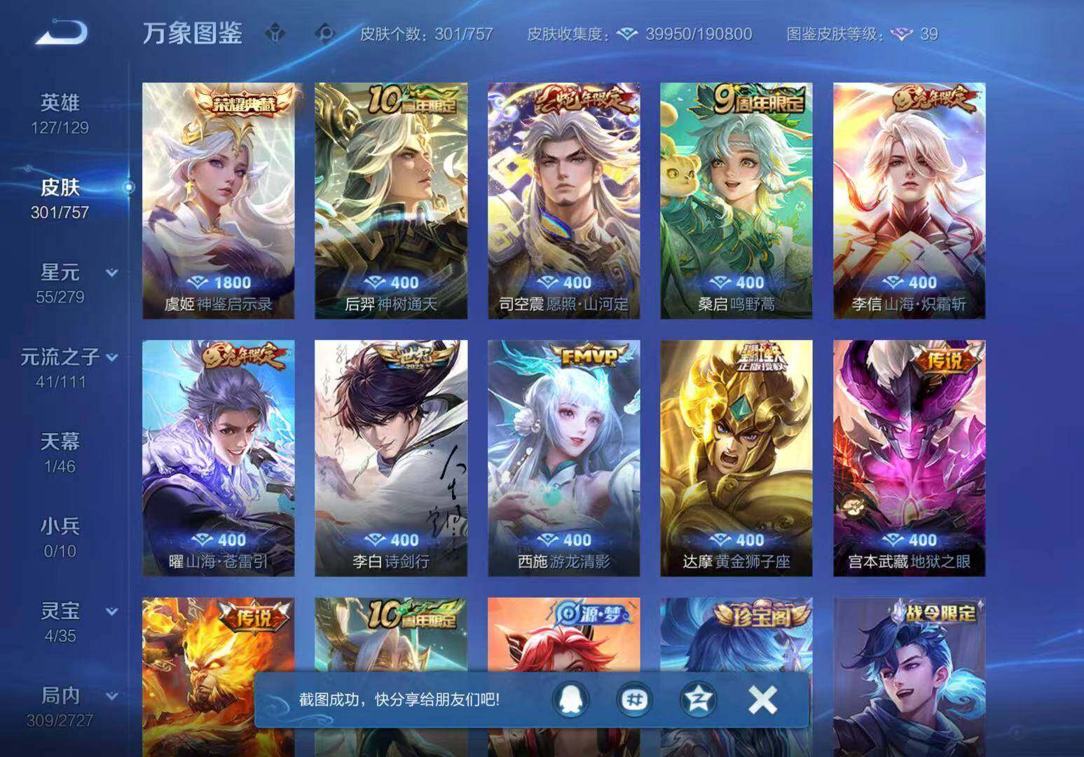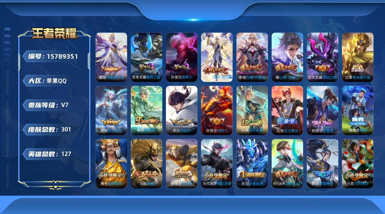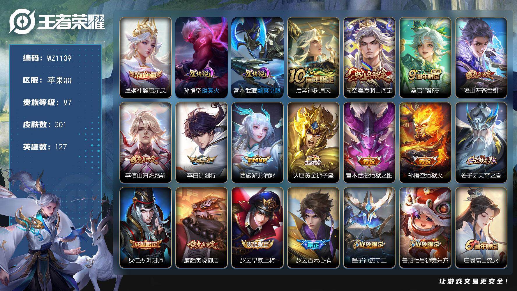 [15789351]苹果Q-301皮肤-1典藏皮肤-10传说-88史诗 【英雄全皮】:猪八戒全皮 【荣耀典藏】:虞姬神鉴启示录 【传说皮肤】:后羿神树通天,司空震愿照山河定,桑启鸣野蒿,曜山海苍雷引,李信山海炽霜斩,李白诗剑行,西施游龙清影,达摩黄金狮子座,宫本武藏地狱之眼,孙悟空地狱火 【限定皮肤】:姜子牙天穹之誓,狄仁杰阴阳师,廉颇寅虎御盾,赵云皇家上将,赵云百木心枪,墨子神迹守卫,鲁班七号狮舞东方,庄周高山流水,高渐离死亡摇滚,高渐离玩趣恶龙,钟无艳超时空战士,白起夜都怪侠,芈月白晶晶,芈月幻夜卜梦,吕布猎兽之王,吕布御风骁将,周瑜赤莲之焰,元歌云间偶戏,元歌无心,夏侯惇朔风刀,甄姬游园惊梦,甄姬落雪兰心,典韦蓝屏警告,马可波罗暗影游猎,马可波罗山海玄木吟,狄仁杰魔术师,狄仁杰万华元夜,达摩星际陆战队,达摩沙漠行僧,项羽海滩派对,老夫子醍醐杖,老夫子航海奇遇记,关羽冰锋战神,程咬金演武夺筹,韩信逐梦之影,韩信傲雪梅枪,兰陵王驯魔猎人,兰陵王金庭之子,亚瑟潮玩骑士王,孙悟空至尊宝,孙悟空孙行者,牛魔御旌,后羿圣弓游侠,李元芳银河之约,李元芳云中旅人,钟馗神迹守卫,钟馗驱傩正仪,杨玉环寅虎心曲,女娲朔望之晖,干将莫邪真爱魔法,雅典娜单词大作战,雅典娜黎明之约,蔡文姬繁星吟游,太乙真人华丽摇滚,鬼谷子原初探秘者,鬼谷子五谷丰年,黄忠火炮绅士,苏烈千军破阵,百里玄策原初追逐者,百里守约朱雀志,弈星混沌棋,梦奇顽趣,沈梦溪星空之诺,沈梦溪大漠名商,明世隐疑决卦,明世隐吟游魔法,裴擒虎天狼狩猎者,裴擒虎李小龙,裴擒虎擒涛扼浪,狂铁御狮,米莱狄御霄,米莱狄胡桃异想国,云中君纤云弄巧,李信山海炽霜斩,盾山御銮,猪八戒西部大镖客,猪八戒猪悟能,上官婉儿梁祝,嫦娥暖冬兔眠,曜山海苍雷引,蒙犽狂想玩偶喵,鲁班大师探海日志,桑启海盐诗旅,暃星界游侠,艾琳女武神,阿古朵江河有灵,张良古海寻踪,裴擒虎梅西,蒙恬荣光圣徽,高渐离燃音魔法,妲己灵卜魔法,鬼谷子天穹祈灯,沈梦溪龙舞盛年,刘邦剑破天穹 【年限皮肤】:百里守约朱雀志,杨玉环寅虎心曲,廉颇寅虎御盾,吕布御风骁将,马超神威,马可波罗山海玄木吟,李信山海炽霜斩,曜山海苍雷引 【赛季限定】:夏侯惇朔风刀,狄仁杰万华元夜,达摩沙漠行僧,老夫子醍醐杖,程咬金演武夺筹,兰陵王金庭之子,张良古海寻踪,牛魔御旌,李元芳云中旅人,钟馗驱傩正仪,雅典娜黎明之约,鬼谷子原