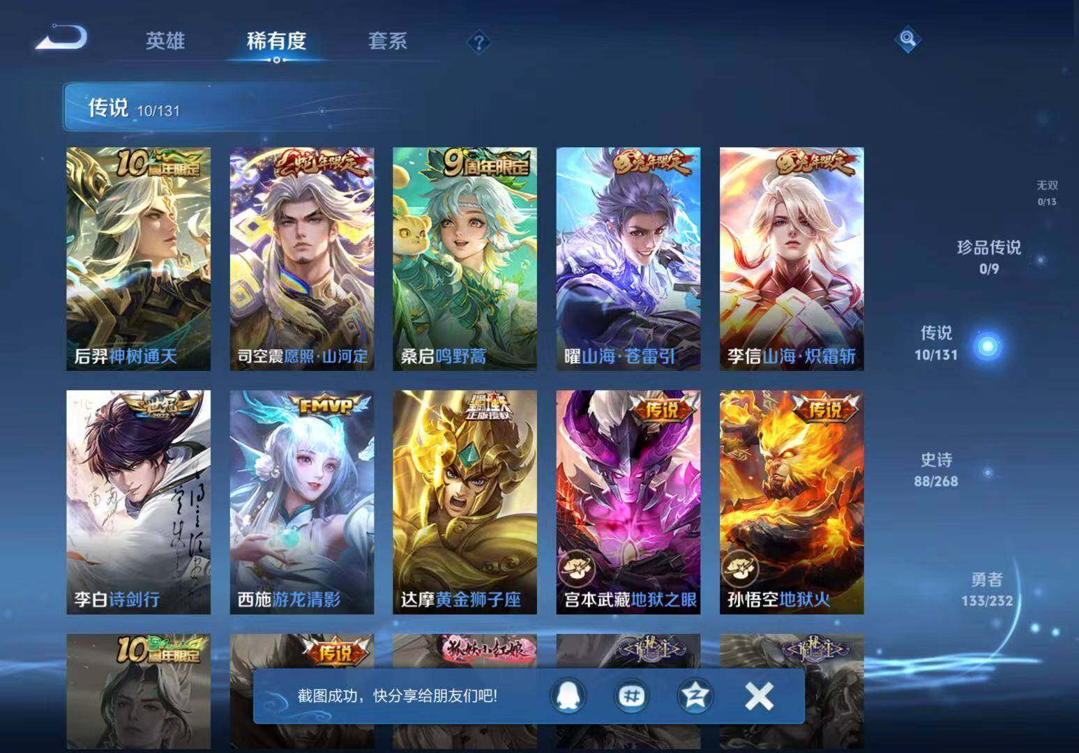 【传说皮肤】:后羿神树通天,司空震愿照山河定,桑启鸣野蒿,曜山海苍雷引,李信山海炽霜斩,李白诗剑行,西施游龙清影,达摩黄金狮子座,宫本武藏地狱之眼,孙悟空地狱火