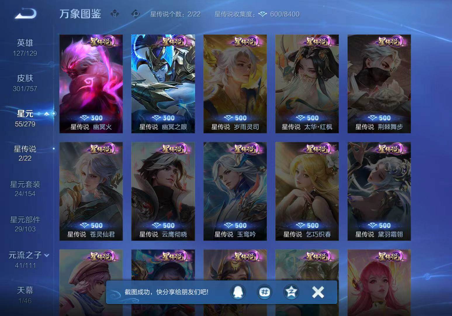 狂铁御狮,米莱狄御霄,牛魔御旌,盾山御銮,夏侯惇朔风刀,明世隐疑决卦,老夫子醍醐杖,鬼谷子原初探秘者,狄仁杰万华元夜,程咬金演武夺筹,钟馗驱傩正仪,苏烈千军破阵,吕布猎兽之王,女娲朔望之晖,典韦蓝屏警告,钟馗神迹守卫,鲁班七号狮舞东方,沈梦溪星空之诺,李元芳银河之约,马可波罗暗影游猎,蒙犽狂想玩偶喵,元歌云间偶戏,弈星混沌棋,达摩沙漠行僧,兰陵王金庭之子,沈梦溪大漠名商,李元芳云中旅人,桑启海盐诗旅,裴擒虎擒涛扼浪,鲁班大师探海日志,张良古海寻踪