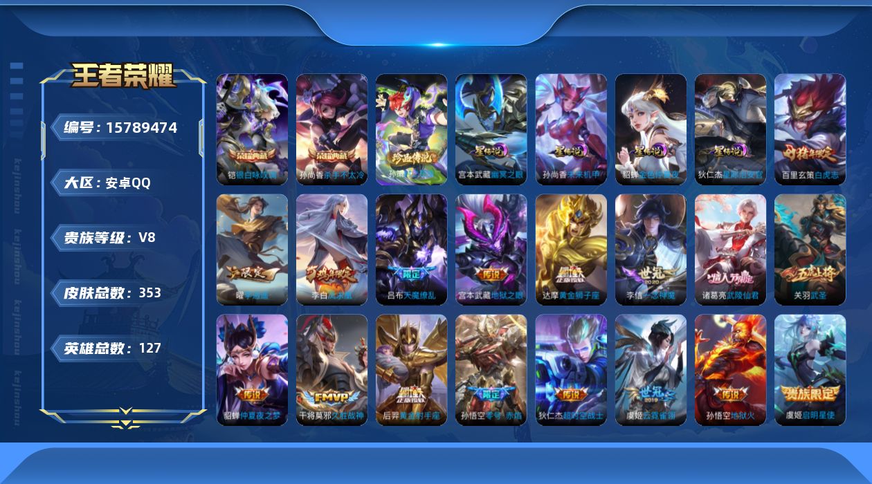 [15789474]安卓Q-V8--353皮肤-2典藏皮肤-1珍品传说-19传说-107史诗 【英雄全皮】:孙权全皮,钟馗全皮,猪八戒全皮,空空儿全皮 【荣耀典藏】:孙尚香杀手不太冷,铠银白咏叹调 【珍品传说】:孙策时之奇旅 【传说皮肤】:后羿神树通天,曜李逍遥 ,虞姬启明星使,孙悟空零号赤焰,关羽武圣,李信一念神魔,张良黄金白羊座,干将莫邪久胜战神,虞姬云霓雀翎,达摩黄金狮子座,百里玄策白虎志,后羿黄金射手座,诸葛亮武陵仙君,貂蝉仲夏夜之梦,李白凤求凰,宫本武藏地狱之眼,孙悟空地狱火,吕布天魔缭乱,狄仁杰超时空战士 【限定皮肤】:白起狰,狄仁杰阴阳师,虞姬凯尔特女王,赵云皇家上将,赵云引擎之心,墨子神迹守卫,妲己时之彼端,嬴政优雅恋人,嬴政白昼王子,孙尚香蔷薇恋人,鲁班七号狮舞东方,庄周云端筑梦师,庄周高山流水,高渐离死亡摇滚,高渐离玩趣恶龙,孙膑妖精王,芈月重明,芈月幻夜卜梦,吕布天魔缭乱,吕布猎兽之王,周瑜赤莲之焰,元歌云间偶戏,元歌无心,夏侯惇朔风刀,甄姬游园惊梦,曹操烛龙,典韦穷奇,典韦蓝屏警告,马可波罗暗影游猎,狄仁杰魔术师,狄仁杰万华元夜,达摩星际陆战队,达摩沙漠行僧,项羽海滩派对,项羽霸王别姬,老夫子圣诞老人,老夫子醍醐杖,老夫子航海奇遇记,关羽冰锋战神,关羽武圣,程咬金演武夺筹,露娜一生所爱,韩信飞衡,兰陵王驯魔猎人,兰陵王金庭之子,花木兰瑞麟志,亚瑟潮玩骑士王,孙悟空至尊宝,孙悟空大圣娶亲,孙悟空零号赤焰,牛魔御旌,后羿如梦令,后羿圣弓游侠,李元芳银河之约,李元芳云中旅人,虞姬启明星使,钟馗神迹守卫,钟馗驱傩正仪,杨玉环遇见飞天,女娲朔望之晖,干将莫邪冰霜恋舞曲,干将莫邪真爱魔法,雅典娜单词大作战,雅典娜黎明之约,蔡文姬繁星吟游,太乙真人饕餮,太乙真人华丽摇滚,鬼谷子原初探秘者,鬼谷子五谷丰年,诸葛亮武陵仙君,黄忠火炮绅士,苏烈千军破阵,百里玄策白虎志,百里玄策原初追逐者,弈星混沌棋,梦奇顽趣,沈梦溪星空之诺,沈梦溪大漠名商,明世隐疑决卦,裴擒虎天狼狩猎者,裴擒虎李小龙,裴擒虎擒涛扼浪,狂铁御狮,米莱狄御霄,米莱狄胡桃异想国,云中君纤云弄巧,伽罗天狼溯光者,盾山御銮,猪八戒西部大镖客,猪八戒猪悟能,上官婉儿梁祝,嫦娥拒霜思,曜李逍遥 ,蒙犽狂想玩偶喵,鲁班大师探海日志,桑启海盐诗旅,阿古朵江河有灵,张良古海寻踪,裴擒虎梅西,鬼谷子天穹祈灯,沈梦溪龙舞盛年 【年限皮