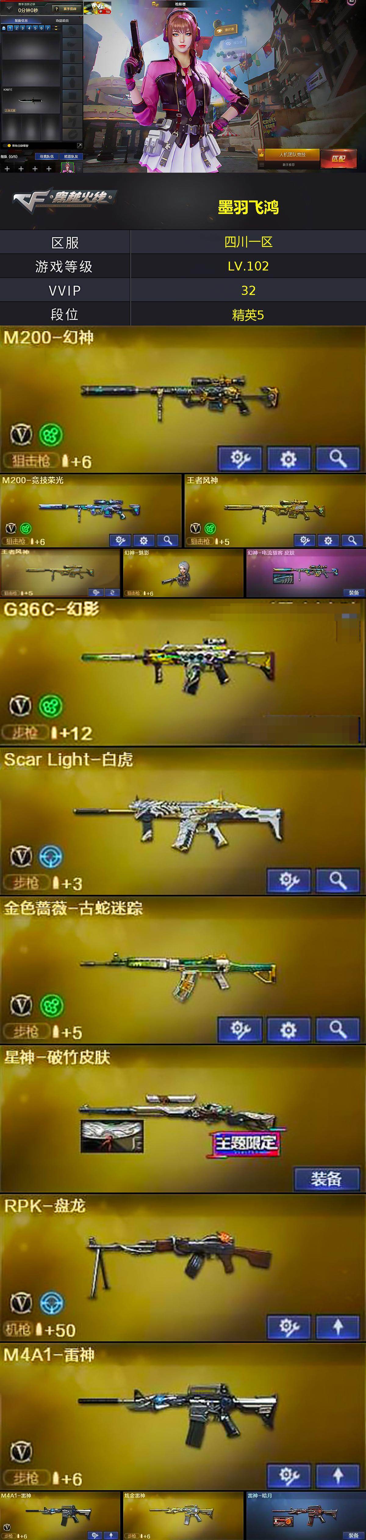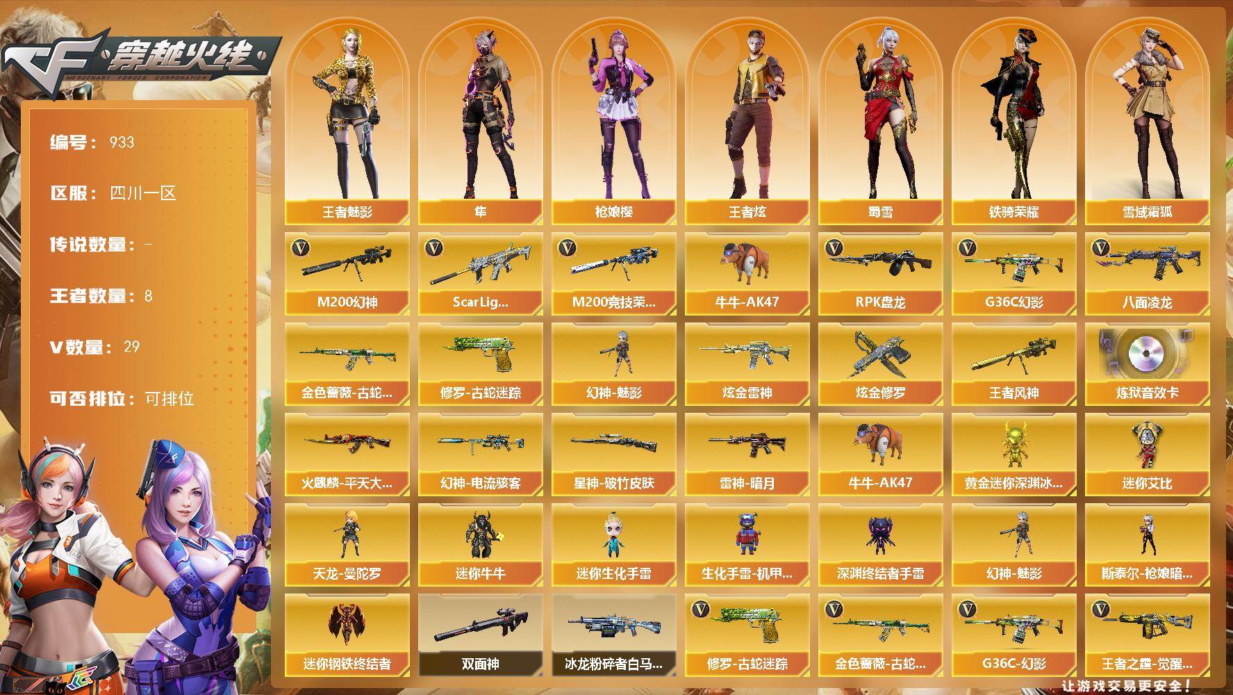 [15790199]四川一区-29V-8王者-2炫金 【热门武器】:G36C-幻影,Scar Light-白虎,M200-幻神,金色蔷薇-古蛇迷踪,修罗-古蛇迷踪,M200-竞技荣光,八面凌龙,牛牛-AK47,RPK-盘龙,幻神-魅影 【王者炫金武器】:王者风神,炫金雷神,炫金修罗 【音效卡】:加特林-炼狱音效卡 【皮肤】:幻神-电流骇客 皮肤,星神-破竹皮肤,雷神-暗月,火麒麟-平天大圣 【角色】:枪娘樱,隼,王者炫,王者-魅影,雪域霜狐,蛇隐宗,奇洋探员,乔伊教练,云海玲珑,暗夜-X,芳心审判者,风暴女,疾风,娟娟,兰-新年限定,0号玩家,龙儿,麻雀,玫瑰花神,潘多拉-X,蛇姬,蜀雪,铁骑荣耀,维纳斯,雪莉杨-摸金校尉,夜玫瑰-宠粉 【人偶武器】:幻神-魅影,天龙-曼陀罗,迷你钢铁终结者,斯泰尔-枪娘暗刃,牛牛-AK47,黄金迷你深渊冰龙,迷你牛牛*2,迷你生化手雷*2,生化手雷-机甲核心*3,深渊终结者手雷,迷你艾比 【暴走生化】:双面神 【挑战大师】:冰龙粉碎者-白马银枪 【英雄级武器】:AK47-火麒麟*3,M4A1-雷神*2,Scar Light-白虎,G36C-幻影,八面凌龙,金色蔷薇-古蛇迷踪,黑骑士-海王,AWM-天龙,M200-幻神,M200-竞技荣光,王者风神-觉醒版,王者凰鸣-觉醒版,RPK-盘龙,悦蓝-惊涛骇浪-觉醒版,王者之霆-觉醒版*2,修罗-古蛇迷踪,擎天,擎天-竞技荣光,高爆手雷-竞技荣光,高爆手雷-古蛇迷踪,闪光弹-竞技荣光,烟雾弹-竞技荣光,烟雾弹-古蛇迷踪 【道具】:CFS限定背包,亚洲杯纪念炫彩背包,冰冰企鹅背包,古蛇迷踪炫彩背包,次元之矛-背包,裂空之翼背包-金色,超级背包,哔哩哔哩名片,黄金生化钩,绿色巨人,灵魂忍者*2,迷雾幽灵,夺命之镰*2,防化服*3,枪王排位28赛季金色流光,枪王排位29赛季金色流光,古蛇迷踪打击特效,蛇隐宗表情,EP战队名片,EP战队喷图,EP战队击杀图标,防弹头盔*3,防弹衣*3,C4工具钳*3,手雷包*3 【特殊枪械】:1白虎,1盘龙