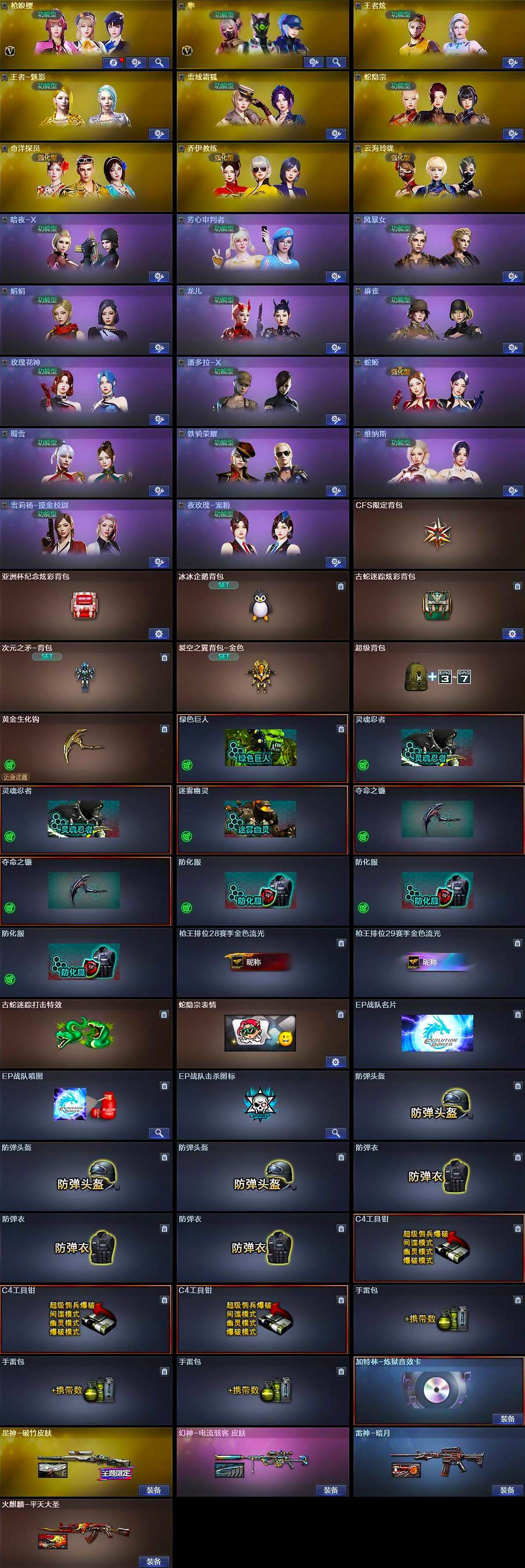 【道具】:CFS限定背包,亚洲杯纪念炫彩背包,冰冰企鹅背包,古蛇迷踪炫彩背包,次元之矛-背包,裂空之翼背包-金色,超级背包,哔哩哔哩名片,黄金生化钩,绿色巨人,灵魂忍者*2,迷雾幽灵,夺命之镰*2,防化服*3,枪王排位28赛季金色流光,枪王排位29赛季金色流光,古蛇迷踪打击特效,蛇隐宗表情,EP战队名片,EP战队喷图,EP战队击杀图标,防弹头盔*3,防弹衣*3,C4工具钳*3,手雷包*3