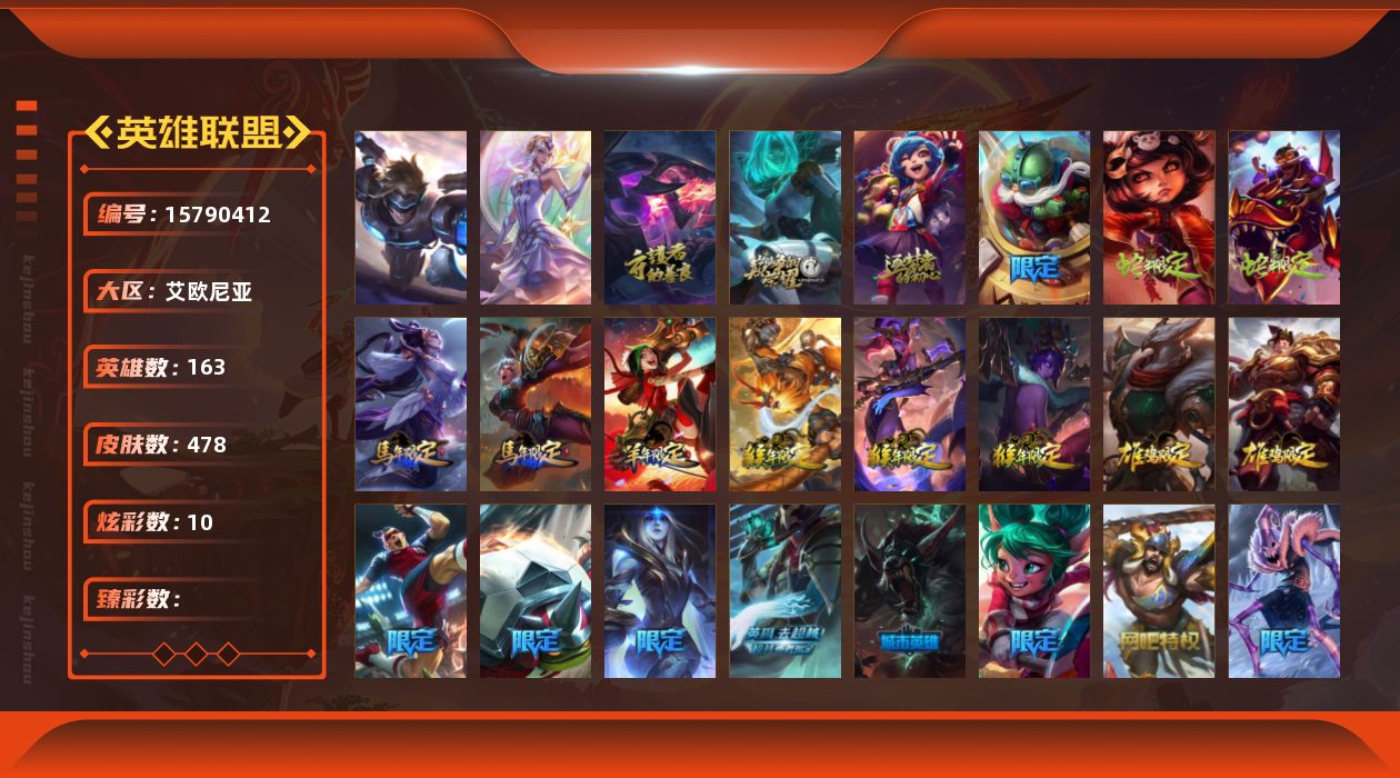 [15790412]未定级段位-163英雄-478皮肤-10炫彩-2终极-3神话-95限定-47传说-116史诗