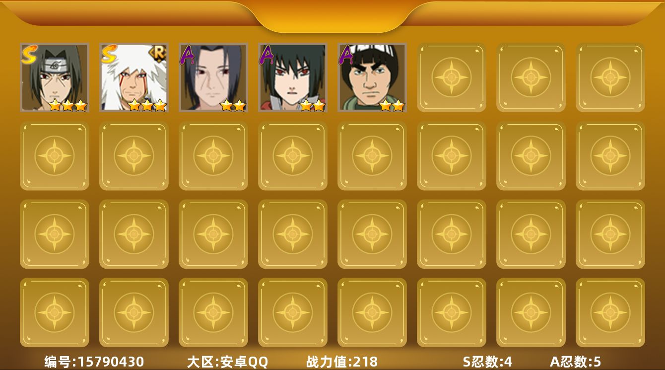 【S级忍者】:宇智波鼬「须佐能乎」(3星),自来也「舞之豪杰」(3星),波风水门「九喇嘛连结」(3星),漩涡鸣人·宇智波佐助(3星)