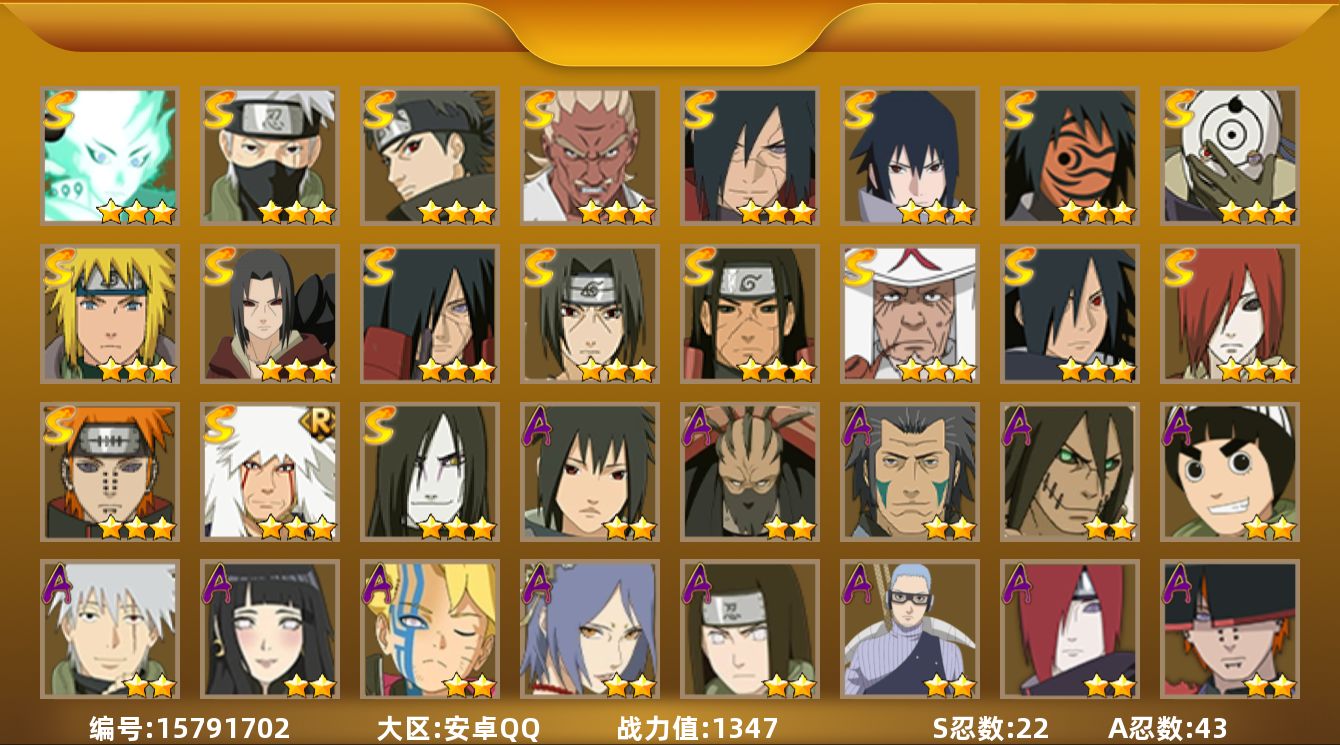 【S级忍者】:长门「秽土转生」(3星),千手柱间「秽土转生」(3星),宇智波鼬「秽土转生」(3星),宇智波斑「秽土转生」(3星),宇智波斑「秽土转生·解」(3星),艾「忍界大战」(3星),宇智波鼬「须佐能乎」(3星),宇智波止水「须佐能乎」(3星),旗木卡卡西「须佐能乎」(3星),宇智波斑「木叶创立」(3星),自来也「舞之豪杰」(3星),大蛇丸(3星),自来也「传说中的三忍」(3星),猿飞日斩(3星),波风水门(3星),神秘面具男「红夜之刃」(3星),佩恩「天道」(3星),宇智波佐助「永恒万花筒」(3星),宇智波斑 「白面具」(3星宇智波斑「白面具」),大筒木舍人「最终章」(3星),波风水门「九喇嘛连结」(3星),漩涡鸣人·宇智波佐助(3星)