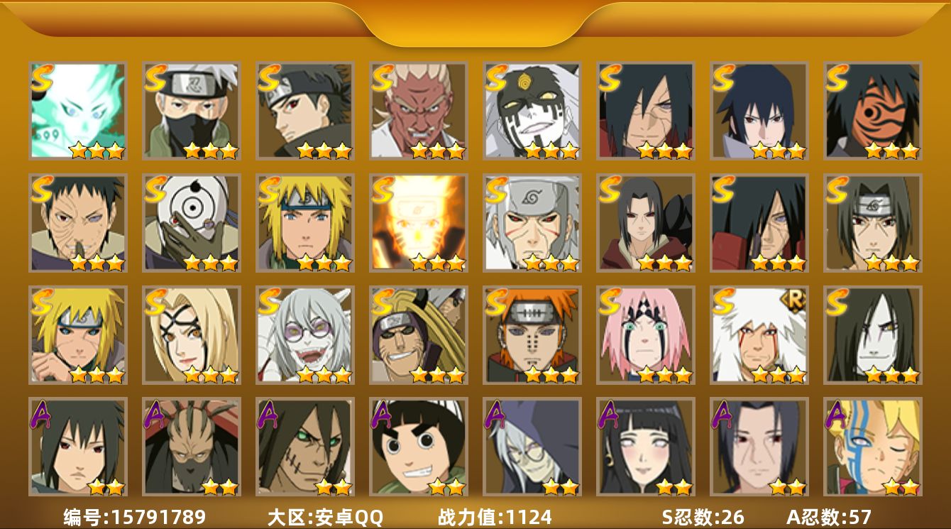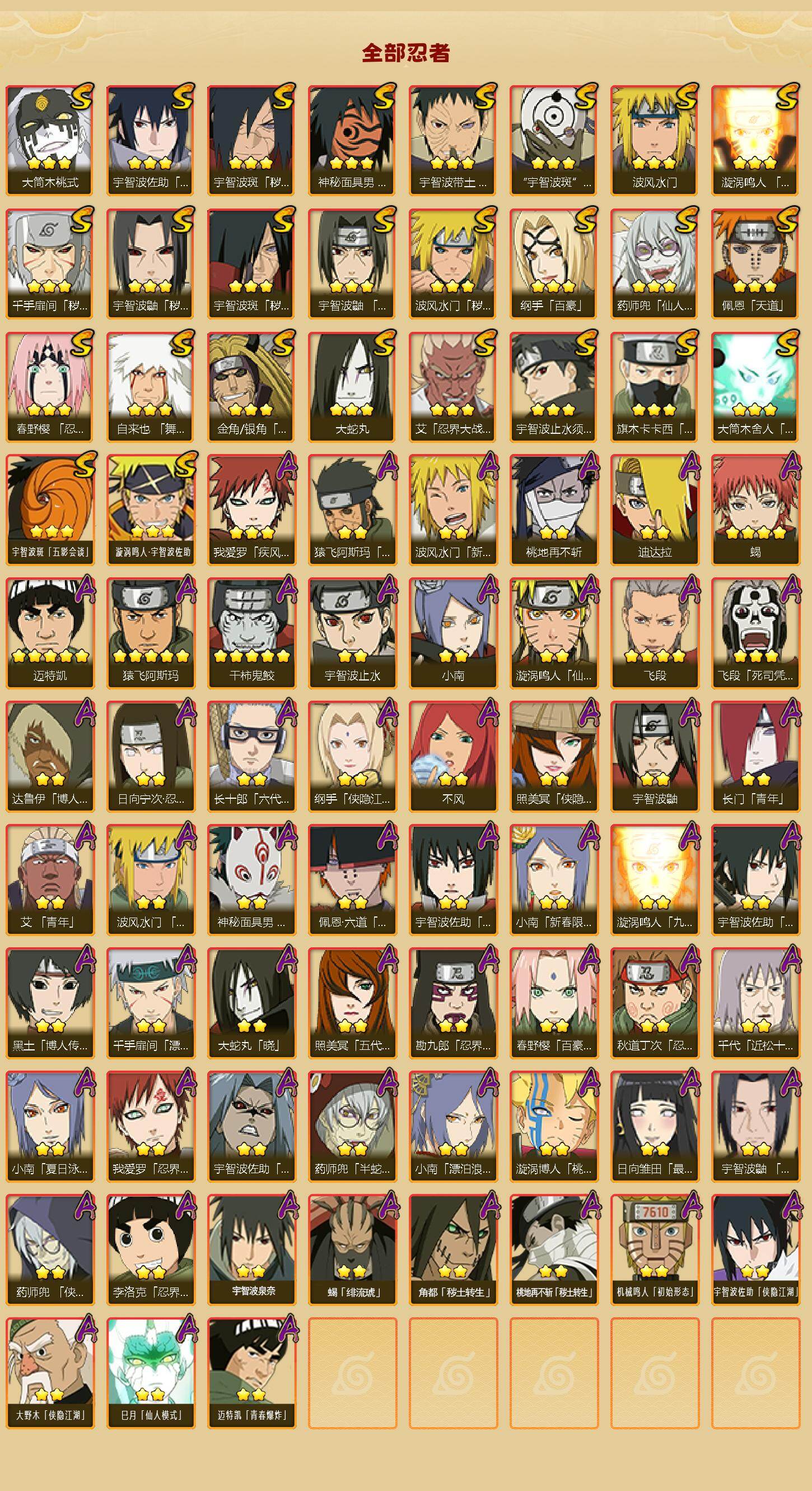 【S级忍者】:金角·银角「秽土转生」(3星),波风水门「秽土转生」(3星),千手扉间「秽土转生」(3星),宇智波鼬「秽土转生」(3星),宇智波斑「秽土转生」(3星),宇智波斑「秽土转生·解」(3星),春野樱「忍界大战」(3星),宇智波带土「忍界大战」(3星),艾「忍界大战」(3星),宇智波鼬「须佐能乎」(3星),宇智波止水「须佐能乎」(3星),旗木卡卡西「须佐能乎」(3星),自来也「舞之豪杰」(3星),大蛇丸(3星),纲手「百豪」(3星),波风水门(3星),药师兜「仙人模式」(3星),神秘面具男「红夜之刃」(3星),漩涡鸣人「九喇嘛连结」(3星),佩恩「天道」(3星),宇智波佐助「永恒万花筒」(3星),宇智波斑 「白面具」(3星宇智波斑「白面具」),大筒木桃式(3星),大筒木舍人「最终章」(3星),宇智波斑「五影会谈」(3星),漩涡鸣人·宇智波佐助(3星)