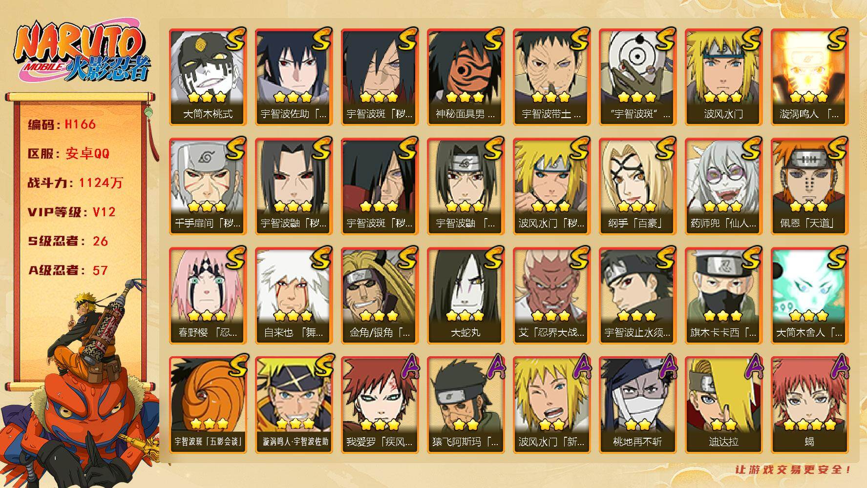 【A级忍者】:艾「青年」(2星),长门「青年」(2星),波风水门「青年」(2星),波风水门「新春限定」(2星),达鲁伊「博人传」(2星),迪达拉(2星),大蛇丸「晓」(2星),飞段(4星),飞段「死司凭血」(3星),干柿鬼鲛(5星),漩涡博人「桃式显现」(2星),漩涡鸣人「仙人模式」(2星),漩涡鸣人「九尾查克拉」(2星),机械鸣人「初始形态」(2星),迈特凯(5星),桃地再不斩(2星),桃地再不斩「秽土转生」(2星),我爱罗「疾风传」(3星),我爱罗「忍界大战」(2星),蝎(4星),蝎「绯流琥」(2星),小南(2星),小南「新春限定」(2星),小南「夏日泳装」(2星),小南「漂泊浪客」(2星),角都「秽土转生」(2星),猿飞阿斯玛(5星),猿飞阿斯玛「秽土转生」(2星),宇智波止水(2星),宇智波鼬(2星),宇智波鼬「夏日限定」(2星),宇智波佐助「须佐能乎」(2星),宇智波佐助「疾风传咒印」(2星),宇智波佐助「万花筒写轮眼」(2星),宇智波佐助「侠隐江湖」(2星),药师兜「半蛇斗篷」(2星),药师兜「侠影江湖」(2星),照美冥「侠隐江湖」(2星),照美冥「五代目水影」(2星),日向宁次「忍界大战」(2星),日向雏田「最终章」(2星),长十郎「六代目水影」(2星),纲手「侠隐江湖」(2星),神秘面具男「忍者之路」(2星),佩恩·六