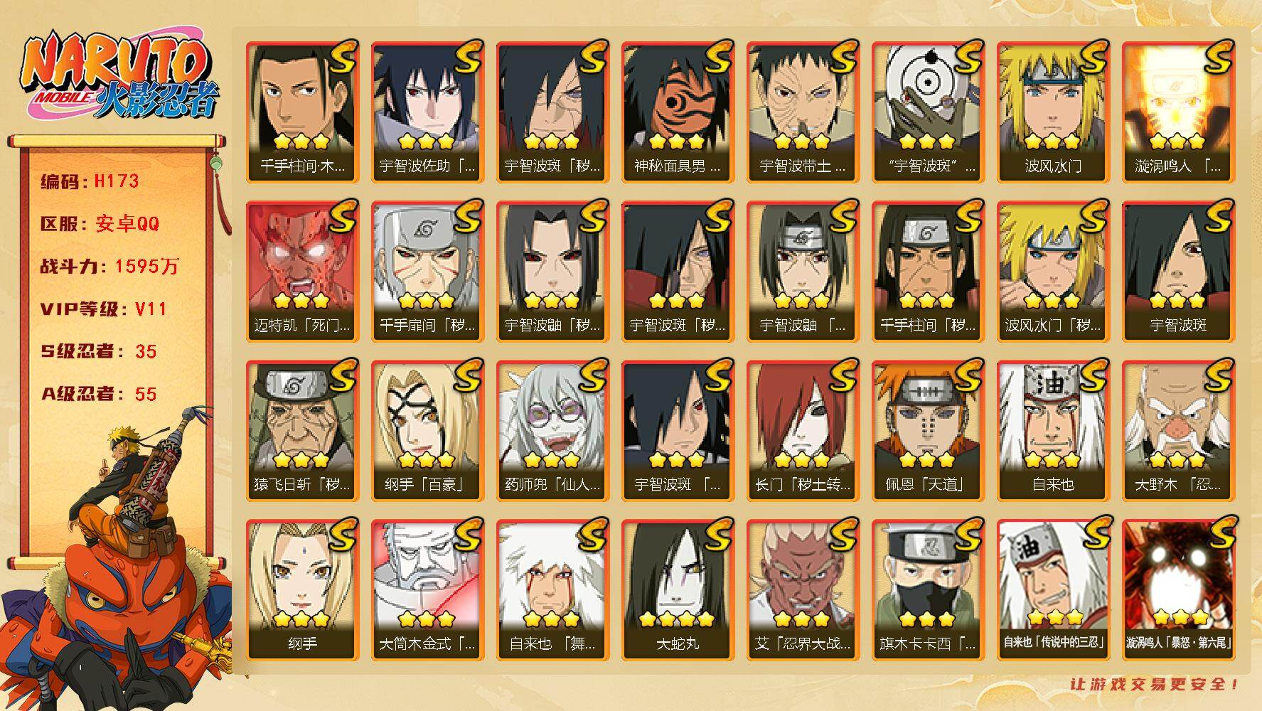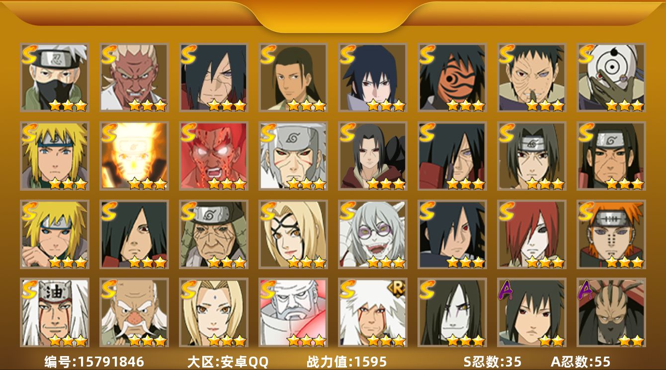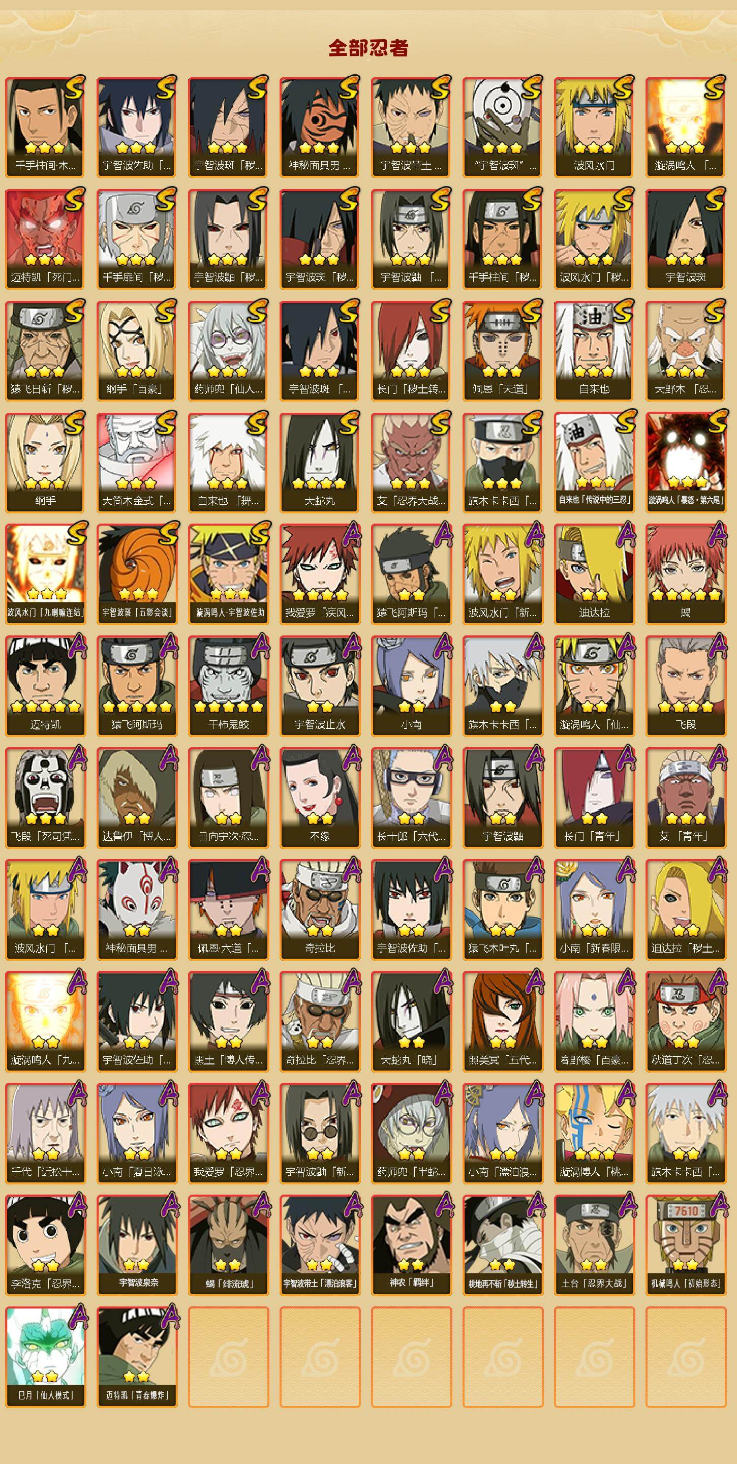 【S级忍者】:长门「秽土转生」(3星),猿飞日斩「秽土转生」(3星),波风水门「秽土转生」(3星),千手扉间「秽土转生」(3星),千手柱间「秽土转生」(3星),宇智波鼬「秽土转生」(3星),宇智波斑「秽土转生」(3星),宇智波斑「秽土转生·解」(3星),大野木「忍界大战」(3星),宇智波带土「忍界大战」(3星),艾「忍界大战」(3星),宇智波鼬「须佐能乎」(3星),旗木卡卡西「须佐能乎」(3星),宇智波斑「木叶创立」(3星),千手柱间「木叶创立」(3星),自来也(3星),自来也「舞之豪杰」(3星),大蛇丸(4星),自来也「传说中的三忍」(3星),纲手(3星),纲手「百豪」(3星),宇智波斑(3星),波风水门(3星),药师兜「仙人模式」(3星),神秘面具男「红夜之刃」(3星),漩涡鸣人「九喇嘛连结」(3星),迈特凯「死门」(3星),佩恩「天道」(3星),宇智波佐助「永恒万花筒」(3星),宇智波斑 「白面具」(3星宇智波斑「白面具」),大筒木金式(3星),漩涡鸣人「暴怒·第六尾」(3星),波风水门「九喇嘛连结」(3星),宇智波斑「五影会谈」(3星),漩涡鸣人·宇智波佐助(3星)