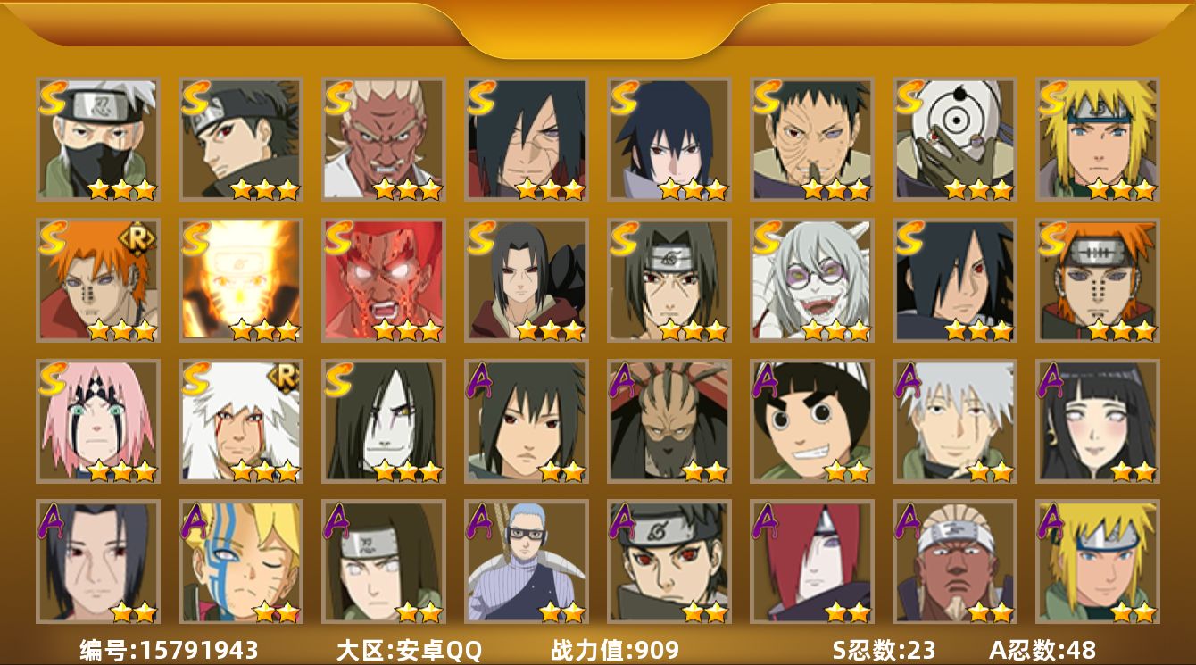 【S级忍者】:宇智波鼬「秽土转生」(3星),宇智波斑「秽土转生·解」(3星),春野樱「忍界大战」(3星),宇智波带土「忍界大战」(3星),艾「忍界大战」(3星),宇智波鼬「须佐能乎」(3星),宇智波止水「须佐能乎」(3星),旗木卡卡西「须佐能乎」(3星),宇智波斑「木叶创立」(3星),自来也「舞之豪杰」(3星),大蛇丸(3星),自来也「传说中的三忍」(3星),波风水门(3星),药师兜「仙人模式」(3星),漩涡鸣人「九喇嘛连结」(3星),迈特凯「死门」(3星),佩恩「天道」(3星),佩恩·天道「超」(3星),宇智波佐助「永恒万花筒」(3星),宇智波斑 「白面具」(3星宇智波斑「白面具」),波风水门「九喇嘛连结」(3星),宇智波斑「五影会谈」(3星),漩涡鸣人·宇智波佐助(3星)