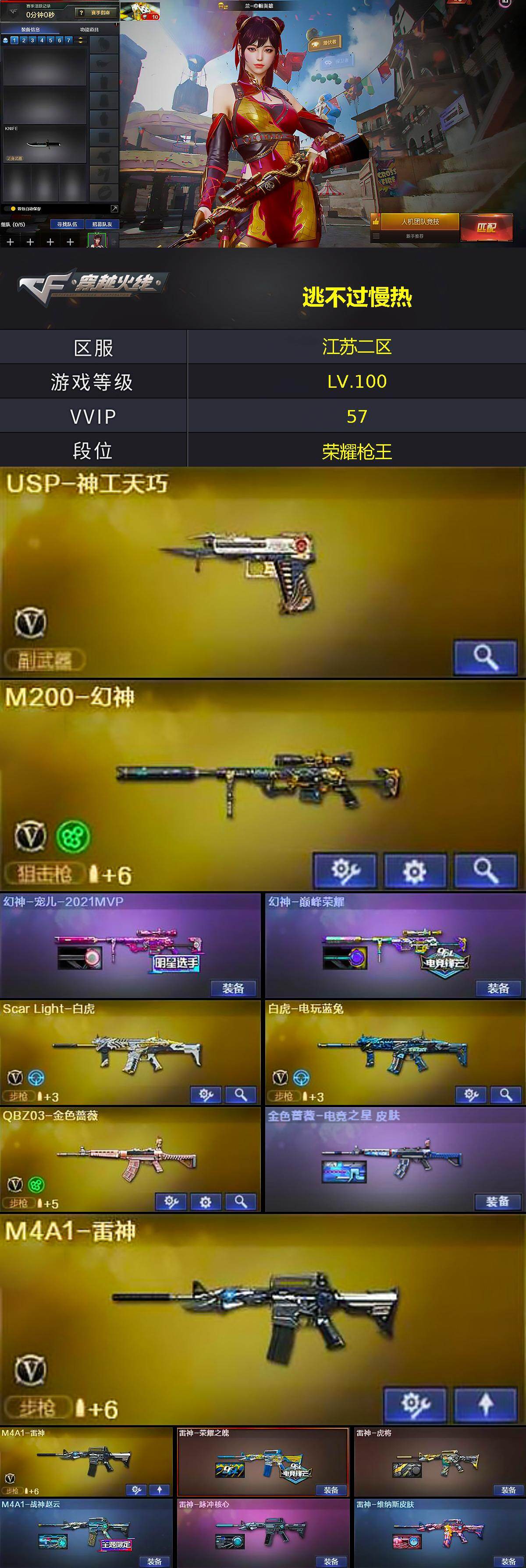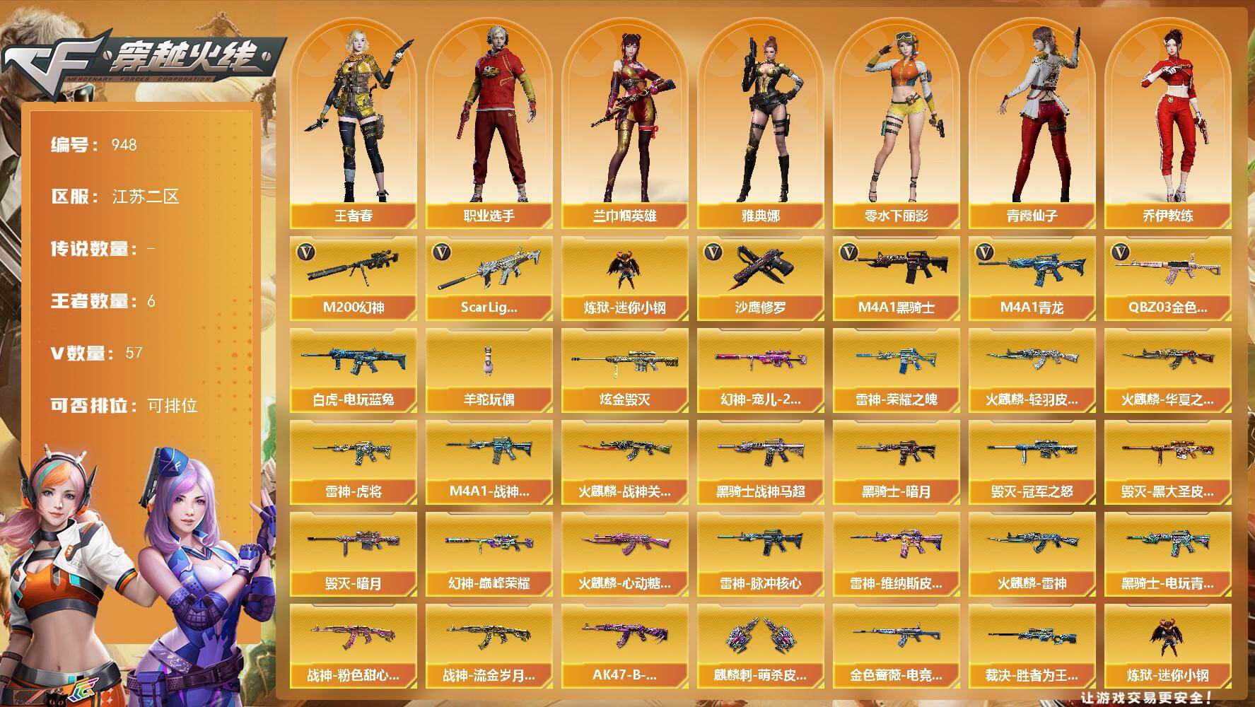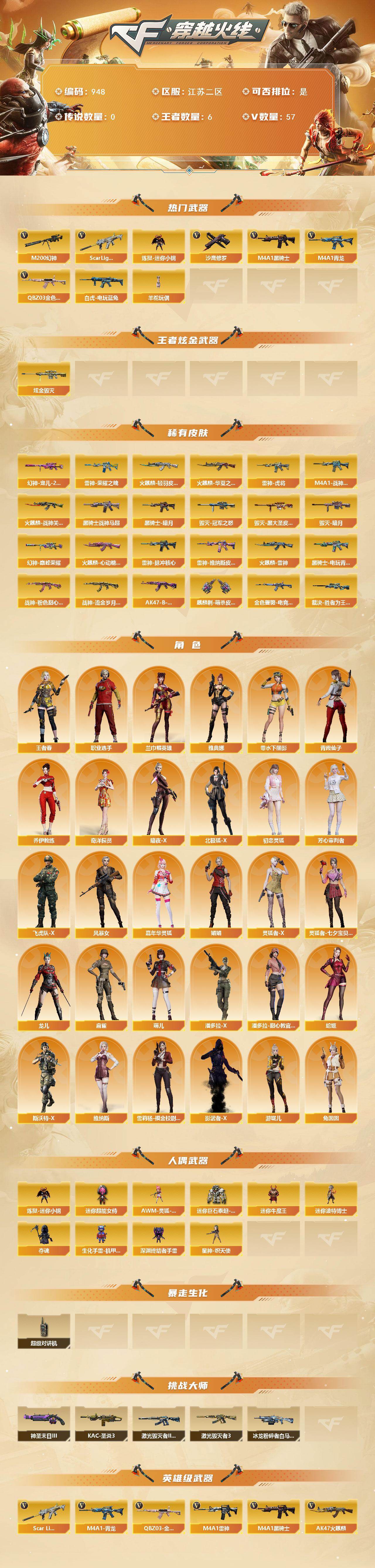 [15792215]江苏二区-57V-6王者-1炫金 【热门武器】:QBZ03-金色蔷薇,Scar Light-白虎,M4A1-青龙,M200-幻神,白虎-电玩蓝兔,炼狱-迷你小钢,M4A1-黑骑士,羊驼玩偶,沙鹰-修罗*2 【王者炫金武器】:炫金毁灭 【皮肤】:幻神-宠儿-2021MVP,幻神-巅峰荣耀,金色蔷薇-电竞之星 皮肤,裁决-胜者为王 皮肤,雷神-荣耀之魄,雷神-虎将,M4A1-战神赵云,雷神-脉冲核心,雷神-维纳斯皮肤,火麒麟-雷神,火麒麟-华夏之心,火麒麟-轻羽皮肤,火麒麟-战神关羽,火麒麟-心动糖果,毁灭-暗月,毁灭-冠军之怒,毁灭-黑大圣皮肤,黑骑士-暗月,黑骑士-战神马超,黑骑士-电玩青兔皮肤,战神-粉色甜心皮肤,战神-流金岁月皮肤,AK47-B-常胜将军-曹操,麒麟刺-萌杀皮肤 【角色】:兰-巾帼英雄,王者春,奇洋探员,乔伊教练,暗夜-X,北极狐-X,初恋灵狐,芳心审判者,飞虎队-X,风暴女,嘉年华灵狐,娟娟,零-水下丽影,灵狐者-X,灵狐者-七夕宝贝,龙儿,麻雀,萌儿,潘多拉-X,潘多拉-甜心教官,青霞仙子,蛇姬,斯沃特-X,兔囡囡,维纳斯,雪莉杨-摸金校尉,影武者-X,游珑儿,职业选手,雅典娜 【人偶武器】:星神-炽天使,炼狱-迷你小钢,AWM-灵狐-15周年嘉年华,迷你牛魔王,迷你波特博士,夺魂,生化手雷-机甲核心*2,深渊终结者手雷,迷你超能女侍,迷你巨石泰坦-魔花研究所 【暴走生化】:超级对讲机 【挑战大师】:冰龙粉碎者-白马银枪,激光毁灭者III-白马银枪,激光毁灭者III,KAC-圣炎切割者III,神圣爆裂者-末日III*2 【英雄级武器】:AK47-火麒麟,M4A1-雷神*2,M4A1-黑骑士,M4A1-青龙,Scar Light-白虎,无影-神兵利器,黑武士-锦绣游龙,QBZ03-金色蔷薇,烈火-动感闪耀,王者之武-觉醒版,AK-47-猩红传说*2,AK47-B-战神,黑骑士-海王,白虎-电玩蓝兔,Barrett-毁灭,Barrett-极光,M200-幻神,王者之力-觉醒版,沙鹰-修罗*2,USP-神工天巧,天神-动感闪耀,麒麟刺,唐刀-神工天巧,屠龙-动感闪耀,龙啸-热带奇洋,高爆手雷-雷霆*2,高爆手雷-神工天巧*2,手雷-动感闪耀,手雷-热带奇洋,闪光弹-雷霆,闪光弹-竞技荣光*3,闪光弹-神工天巧*2,闪光弹-云龙,闪光弹-雷霆王者-