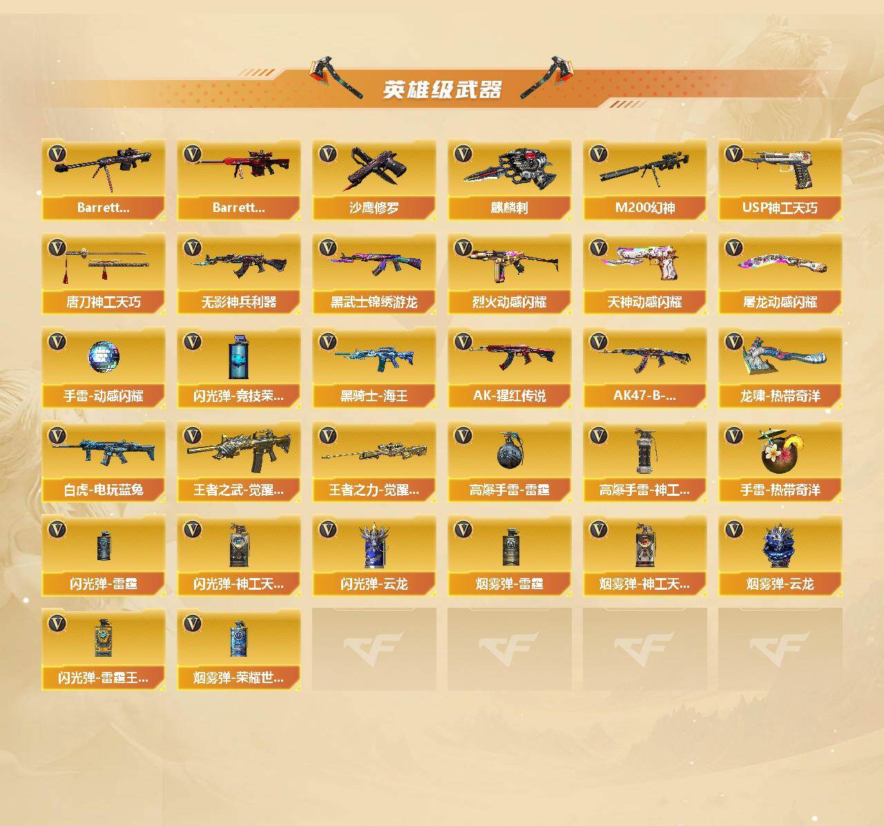 【英雄级武器】:AK47-火麒麟,M4A1-雷神*2,M4A1-黑骑士,M4A1-青龙,Scar Light-白虎,无影-神兵利器,黑武士-锦绣游龙,QBZ03-金色蔷薇,烈火-动感闪耀,王者之武-觉醒版,AK-47-猩红传说*2,AK47-B-战神,黑骑士-海王,白虎-电玩蓝兔,Barrett-毁灭,Barrett-极光,M200-幻神,王者之力-觉醒版,沙鹰-修罗*2,USP-神工天巧,天神-动感闪耀,麒麟刺,唐刀-神工天巧,屠龙-动感闪耀,龙啸-热带奇洋,高爆手雷-雷霆*2,高爆手雷-神工天巧*2,手雷-动感闪耀,手雷-热带奇洋,闪光弹-雷霆,闪光弹-竞技荣光*3,闪光弹-神工天巧*2,闪光弹-云龙,闪光弹-雷霆王者-