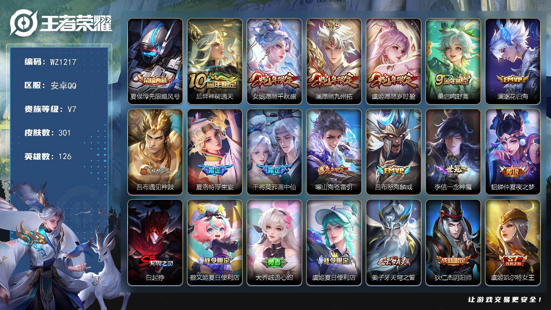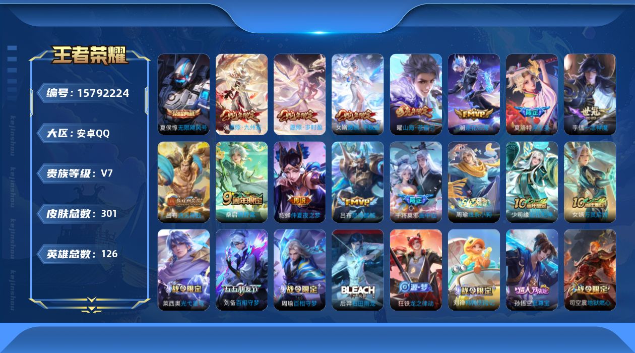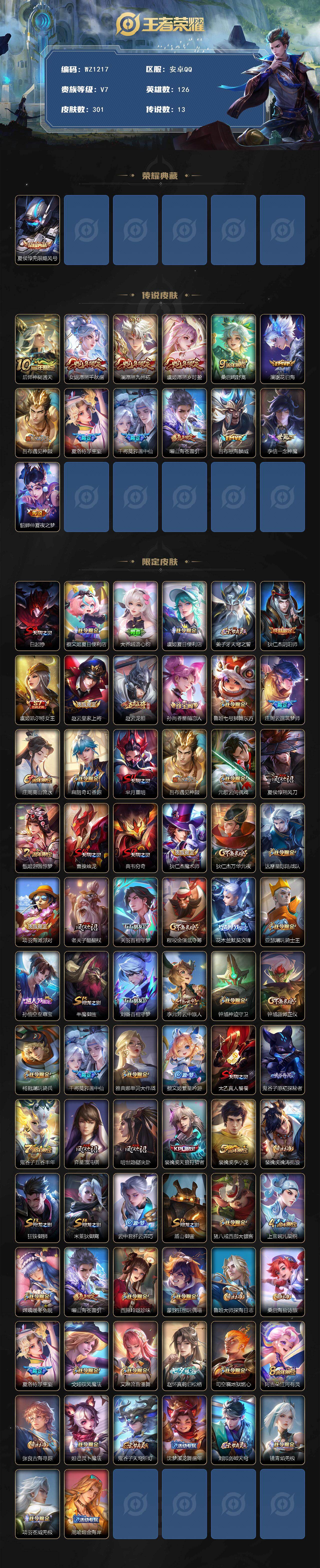 [15792224]安卓Q-V7-至尊星耀V段位-126英雄-301皮肤-1典藏皮肤-13传说-83史诗