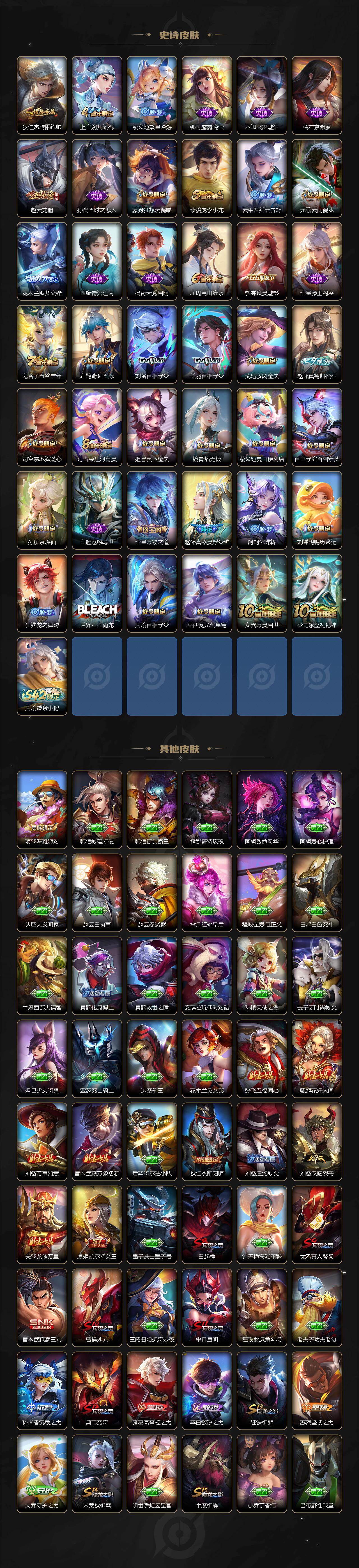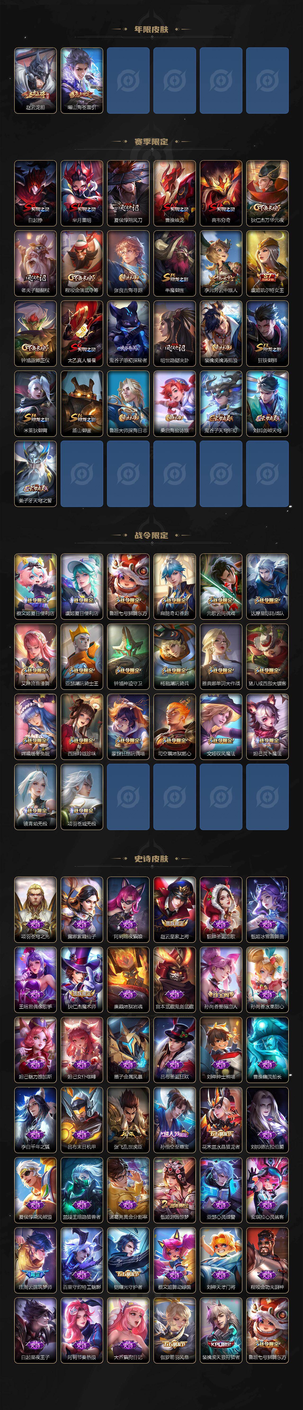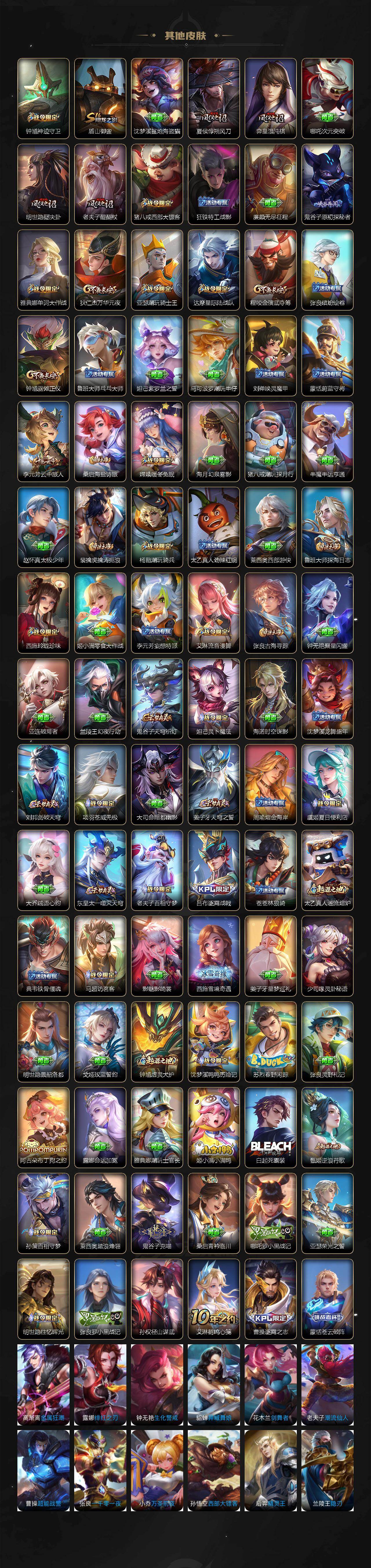 【限定皮肤】:白起狰,蔡文姬夏日便利店,大乔绒语心约,虞姬夏日便利店,姜子牙天穹之誓,狄仁杰阴阳师,虞姬凯尔特女王,赵云皇家上将,赵云龙胆,孙尚香蔷薇恋人,鲁班七号狮舞东方,庄周云端筑梦师,庄周高山流水,扁鹊奇幻香踪,芈月重明,吕布遇见神鼓,元歌云间偶戏,夏侯惇朔风刀,甄姬游园惊梦,曹操烛龙,典韦穷奇,狄仁杰魔术师,狄仁杰万华元夜,达摩星际陆战队,项羽海滩派对,老夫子醍醐杖,关羽百相守梦,程咬金演武夺筹,花木兰默契交锋,亚瑟潮玩骑士王,孙悟空至尊宝,牛魔御旌,刘备百相守梦,李元芳云中旅人,钟馗神迹守卫,钟馗驱傩正仪,杨戬潮玩骑兵,干将莫邪画中仙,雅典娜单词大作战,蔡文姬繁星吟游,太乙真人饕餮,鬼谷子原初探秘者,鬼谷子五谷丰年,弈星混沌棋,明世隐疑决卦,裴擒虎天狼狩猎者,裴擒虎李小龙,裴擒虎擒涛扼浪,狂铁御狮,米莱狄御霄,云中君纤云弄巧,盾山御銮,猪八戒西部大镖客,上官婉儿梁祝,嫦娥暖冬兔眠,曜山海苍雷引,西施玲珑珍味,蒙犽狂想玩偶喵,鲁班大师探海日志,桑启海盐诗旅,夏洛特浮生妄,戈娅驭风魔法,艾琳流音漫舞,赵怀真鹤归松栖,司空震地狱燃心,阿古朵江河有灵,张良古海寻踪,妲己灵卜魔法,鬼谷子天穹祈灯,沈梦溪龙舞盛年,刘邦剑破天穹,镜青焰无极,项羽苍威无极,周瑜熔金海岸
