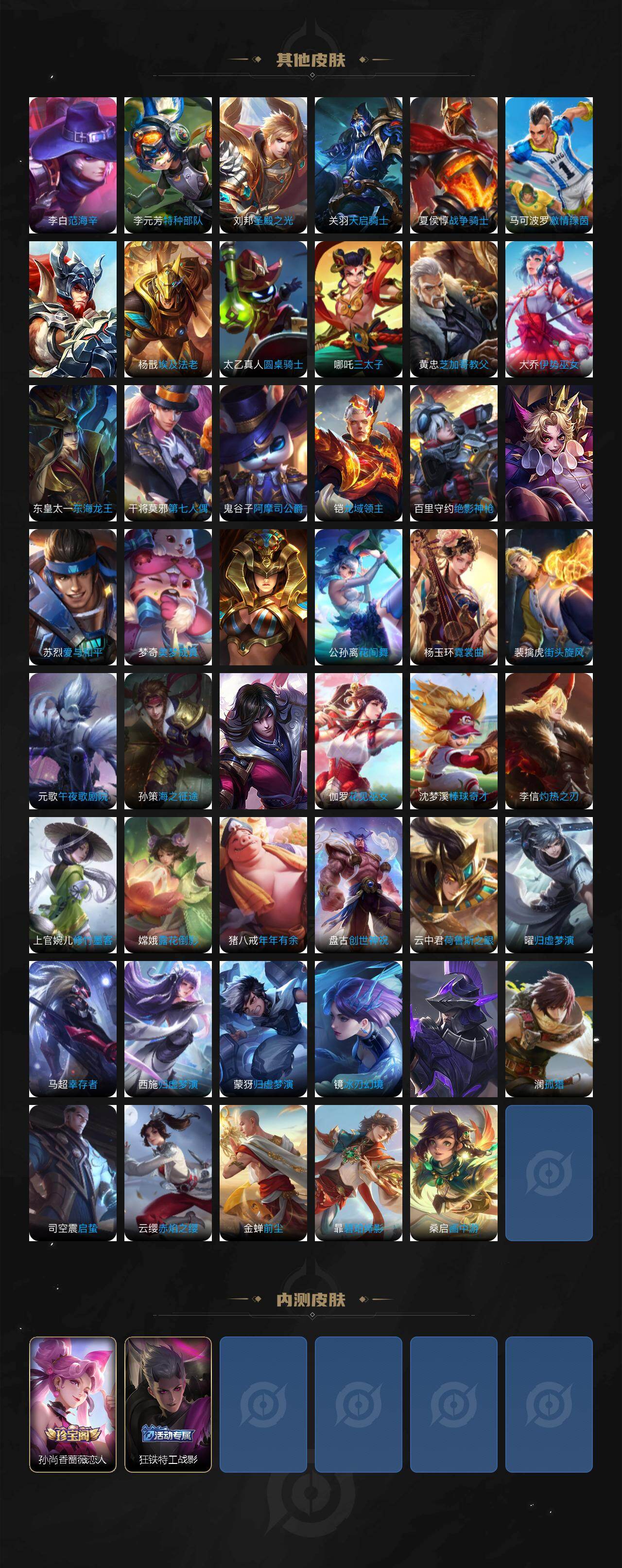 娜可露露晚萤,伽罗箭羽风息,不知火舞魅语,大乔猫狗日记,阿轲节奏热浪,露娜紫霞仙子,诸葛亮黄金分割率,王昭君偶像歌手,项羽苍穹之光,孙尚香时之恋人,阿轲暗夜猫娘,吕布末日机甲,橘右京修罗,刘禅绅士熊喵,刘禅天才门将,白起星夜王子,安琪拉心灵骇客,程咬金功夫厨神,刘邦德古拉伯爵,兰陵王暗隐猎兽者,曹操幽灵船长,宫本武藏鬼剑武藏,亚瑟心灵战警,杨戬天秀·启明,蔡文姬舞动绿茵,廉颇地狱岩魂,西施诗语江南,夏侯惇乘风破浪,花木兰水晶猎龙者,铠曙光守护者,墨子金属风暴,吕布圣诞狂欢,貂蝉圣诞恋歌,百里守约特工魅影,李白千年之狐,貂蝉唤灵魅影,弈星滕王阁序,刘备百相守梦,关羽百相守梦,赵怀真鹤归松栖,白起苍鳞隐世,赵怀真器灵·浮梦炉