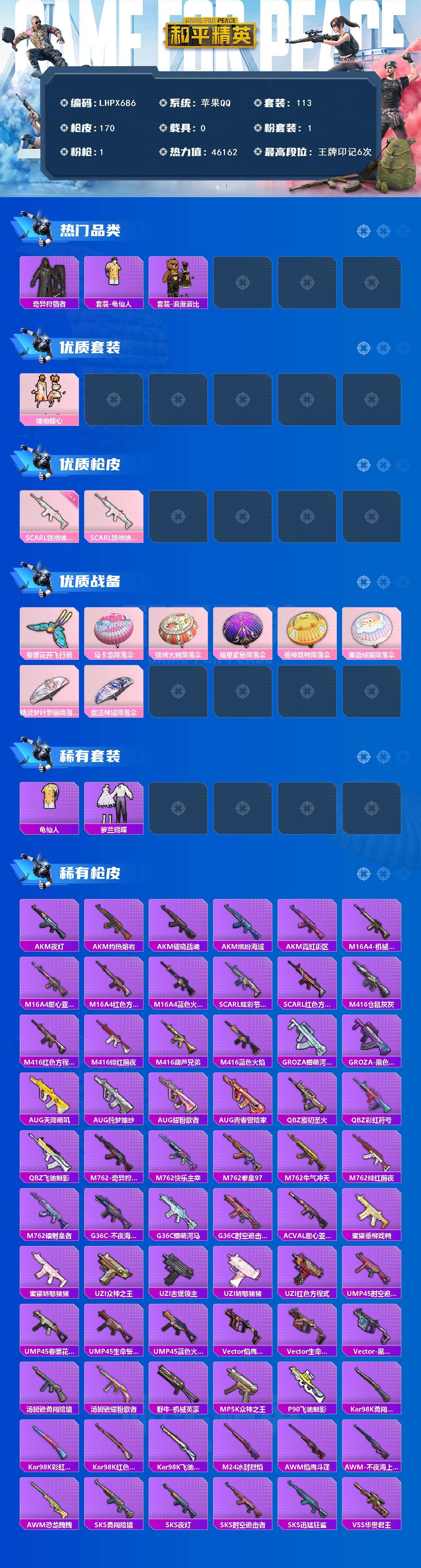 [15793458]【店主推荐捡漏号!可直接换绑】苹果 手Q-1粉装-1特效枪-0载具-1粉色飞行器-46162热力值-6王牌印记-113套装-170枪皮 【热门品类】:套装-奇异狩猎者,套装-龟仙人,套装-浪漫波比 【粉色套装】:粉装-橘柚倾心 【粉色枪皮等级】:SCAR-L-锦绣绵绵(五级) 【粉色枪皮】:SCAR-L-锦绣绵绵 【粉色飞行器】:春暖花开飞行器 【粉色降落伞】:马卡龙降落伞,锦绣火鲤降落伞,暗星紫秘降落伞,垂柳戏鸭降落伞,蜜语绒猫降落伞,精灵梦叶罗丽降落伞,魔法神域降落伞 【稀有套装】:套装-龟仙人,套装-萝兰蝴蝶 【稀有枪皮】:AKM-夜灯,AKM-灼热熔岩,AKM-破晓战魂,AKM-缤纷海域,AKM-霓虹街区,M16A4-机械英豪,M16A4-甜心亚梦,M16A4-红色方程式,M16A4-蓝色火焰,SCAR-L-炫彩节奏,SCAR-L-红色方程式,M416-仓鼠灰灰,M416-红色方程式,M416-绯红前夜,M416-葫芦兄弟,M416-蓝色火焰,GROZA-懵萌河马,GROZA-黑色刀锋,AUG-天降萌叽,AUG-纯梦嫁纱,AUG-耀粉歌者,AUG-青春冒险家,QBZ-原初圣火,QBZ-彩虹符号,QBZ-飞驰魅影,M762-奇异狩猎者,M762-快乐主宰,M762-拳皇97,M762-牛气冲天,M762-绯红前夜,M762-镭射皇者,G36C-不夜海上花,G36C-懵萌河马,G36C-时空追击者,AC-VAL-甜心亚梦,蜜獾-垂柳戏鸭,蜜獾-娇憨猪猪,UZI-众神之王,UZI-古堡领主,UZI-娇憨猪猪,UZI-红色方程式,UMP45-时空追击者,UMP45-春暖花开,UMP45-生命誓言,UMP45-蓝色火焰,Vector-焰鹰斗篷,Vector-生命誓言,Vector-黑色刀锋,汤姆逊-勇闯险境,汤姆逊-耀粉歌者,野牛-机械英豪,MP5K-众神之王,P90-飞驰魅影,Kar98K-勇闯险境,Kar98K-彩虹符号,Kar98K-红色方程式,Kar98K-飞驰魅影,M24-冰封烈焰,AWM-焰鹰斗篷,AWM-不夜海上花,AWM-恐龙拽拽,SKS-勇闯险境,SKS-夜灯,SKS-时空追击者,SKS-迅猛狂鲨,VSS-华贵君王,VSS-镭射皇者,VSS-黑色刀锋,Mini14-原初圣火,Mini14-穿刺龙虾,Mini14-马卡龙,Win94-机械英豪,SLR
