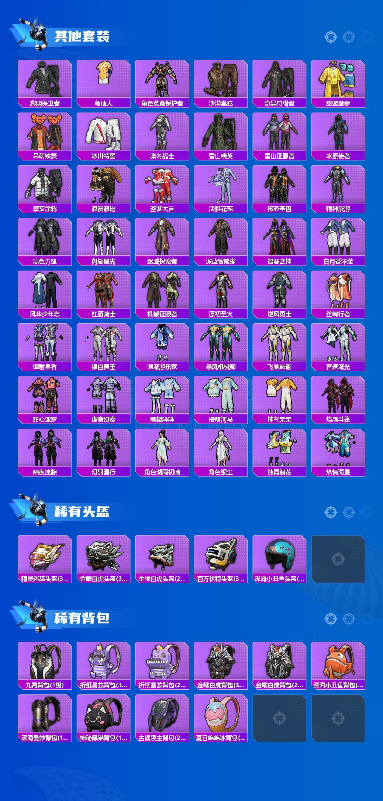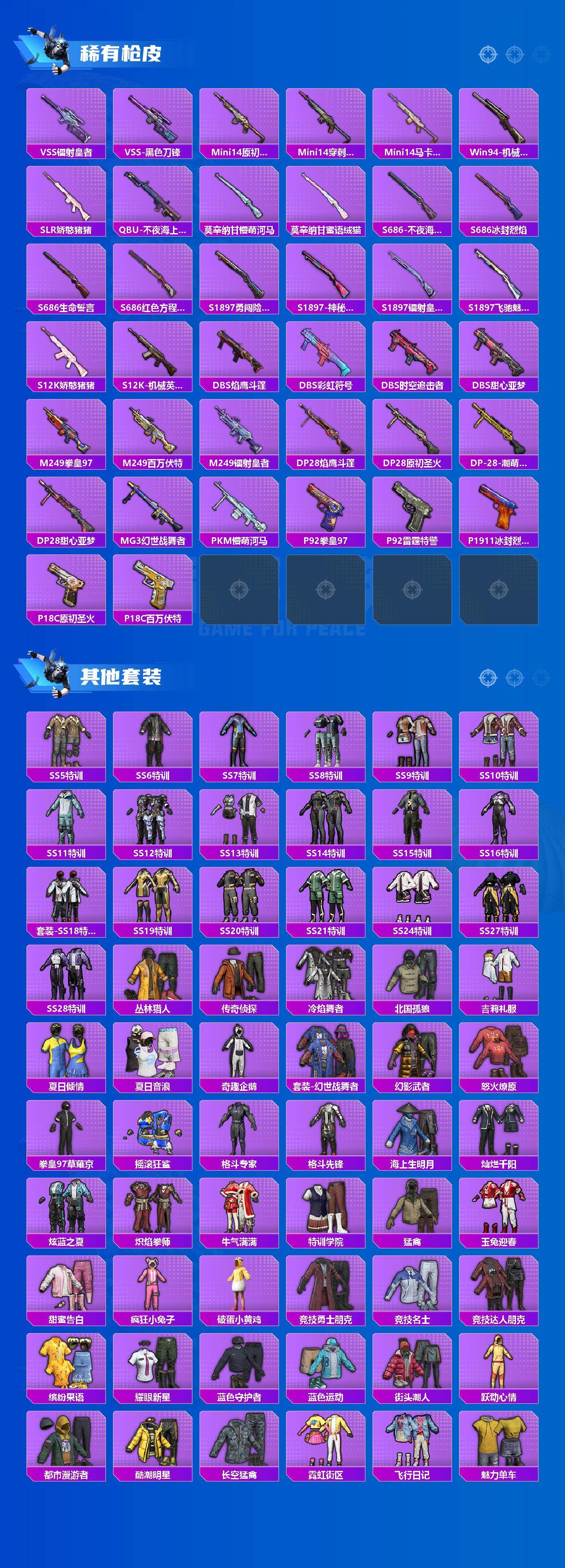 【稀有枪皮】:AKM-夜灯,AKM-灼热熔岩,AKM-破晓战魂,AKM-缤纷海域,AKM-霓虹街区,M16A4-机械英豪,M16A4-甜心亚梦,M16A4-红色方程式,M16A4-蓝色火焰,SCAR-L-炫彩节奏,SCAR-L-红色方程式,M416-仓鼠灰灰,M416-红色方程式,M416-绯红前夜,M416-葫芦兄弟,M416-蓝色火焰,GROZA-懵萌河马,GROZA-黑色刀锋,AUG-天降萌叽,AUG-纯梦嫁纱,AUG-耀粉歌者,AUG-青春冒险家,QBZ-原初圣火,QBZ-彩虹符号,QBZ-飞驰魅影,M762-奇异狩猎者,M762-快乐主宰,M762-拳皇97,M762-牛气冲天,M762-绯红前夜,M762-镭射皇者,G36C-不夜海上花,G36C-懵萌河马,G36C-时空追击者,AC-VAL-甜心亚梦,蜜獾-垂柳戏鸭,蜜獾-娇憨猪猪,UZI-众神之王,UZI-古堡领主,UZI-娇憨猪猪,UZI-红色方程式,UMP45-时空追击者,UMP45-春暖花开,UMP45-生命誓言,UMP45-蓝色火焰,Vector-焰鹰斗篷,Vector-生命誓言,Vector-黑色刀锋,汤姆逊-勇闯险境,汤姆逊-耀粉歌者,野牛-机械英豪,MP5K-众神之王,P90-飞驰魅影,Kar98K-勇闯险境,Kar98K-彩虹符号,Kar98K-红色方程式,Kar98K-飞驰魅影,M24-冰封烈焰,AWM-焰鹰斗篷,AWM-不夜海上花,AWM-恐龙拽拽,SKS-勇闯险境,SKS-夜灯,SKS-时空追击者,SKS-迅猛狂鲨,VSS-华贵君王,VSS-镭射皇者,VSS-黑色刀锋,Mini14-原初圣火,Mini14-穿刺龙虾,Mini14-马卡龙,Win94-机械英豪,SLR
