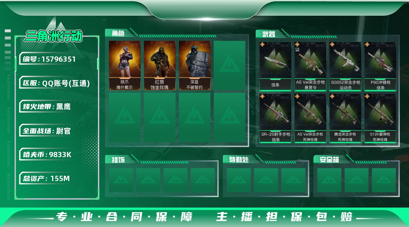 [15796351]【店主推荐捡漏号!可直接换绑】总资产155m 9833k哈伏币-122m流动资产-60烽火等级-黑鹰-50战场等级-尉官 【干员外观】:红狼-蚀金玫瑰,骇爪-维什戴尔,深蓝-不破誓约 【近战皮肤】:近战-信条,近战-黑鹰 【传说级普通外观】:M4A1突击步枪-蚀金玫瑰,M4A1突击步枪-阿米娅,ASh-12战斗步枪-鹅鸭杀,SG552突击步枪-运动员,AK-12突击步枪-特斯拉线圈,SCAR-H战斗步枪-水墨云图,SCAR-H战斗步枪-启航,CAR-15突击步枪-阿米娅,AS Val突击步枪-死神玫瑰,腾龙突击步枪-捞点薯条,腾龙突击步枪-死神玫瑰,KC17突击步枪-电锯惊魂,P90冲锋枪-信条,UZI冲锋枪-特斯拉线圈,SR-3M紧凑突击步枪-特斯拉线圈,勇士冲锋枪-能天使-午夜邮差,QCQ171冲锋枪-鹅鸭杀,S12K霰弹枪-死神玫瑰,M250通用机枪-骑士之心,QJB201轻机枪-鹅鸭杀,SR-25射手步枪-信条,R93狙击步枪-维什戴尔,AWM狙击步枪-捞点薯条,93R-捞点薯条 【史诗级普通外观】:QBZ95-1突击步枪-曙光,ASh-12战斗步枪-无极限,AUG突击步枪-蝮蛇,SCAR-H战斗步枪-囚徒,PTR-32突击步枪-工业狂潮,AS Val突击步枪-百步穿杨,K437突击步枪-守护者,MP5冲锋枪-战术竞备,MP5冲锋枪-竞技风,Vector冲锋枪-异域战争,SR-3M紧凑突击步枪-战术竞备,勇士冲锋枪-工业狂潮,MP7冲锋枪-守护者,S12K霰弹枪-曙光,Mini-14射手步枪-守护者,SV-98狙击步枪-林中猎手,SV-98狙击步枪-囚徒,M700狙击步枪-竞技风,M700狙击步枪-蝮蛇,AWM狙击步枪-无极限,复合弓-守护者 【稀有级普通外观】:ASh-12战斗步枪-星链科技,AUG突击步枪-全金属外壳,SCAR-H战斗步枪-荣耀列队,PTR-32突击步枪-天网,AS Val突击步枪-哈夫克科技,MP5冲锋枪-弄臣,MP5冲锋枪-虎啸,P90冲锋枪-医疗协议,Vector冲锋枪-先锋,SMG-45-行动开启,M1014霰弹枪-幻影结构,M249轻机枪-战损,Mini-14射手步枪-荣耀列队,M14射手步枪-出厂配置,SKS射手步枪-弄臣,SR-25射手步枪-开拓,SR-9射手步枪-街头涂鸦,SV-98狙击步枪-星链科技,G18-星链科技