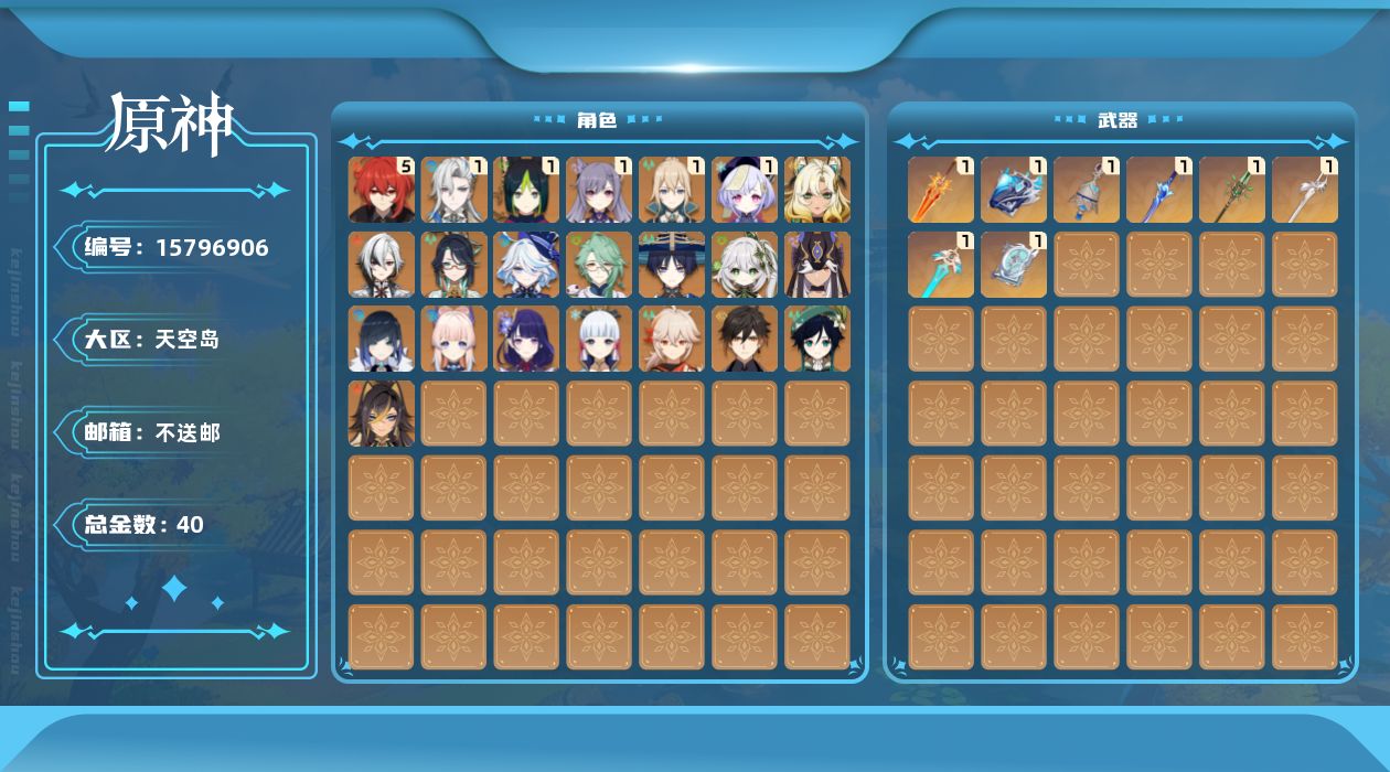 0命阿蕾奇诺,0命闲云,0命芙宁娜,1命那维莱特,0命白术,0命迪希雅,0命流浪者,0命纳西妲,0命赛诺,1命提纳里,0命夜兰,0命雷电将军,0命枫原万叶,0命神里绫华,0命钟离,0命温迪,0命珊瑚宫心海,1命刻晴,1命七七,1命琴,5命迪卢克,0命希诺宁,精1万世流涌大典,精1图莱杜拉的回忆,精1波乱月白经津,精1四风原典,精1和璞鸢,精1天空之刃,精1风鹰剑,精1焚曜千阳