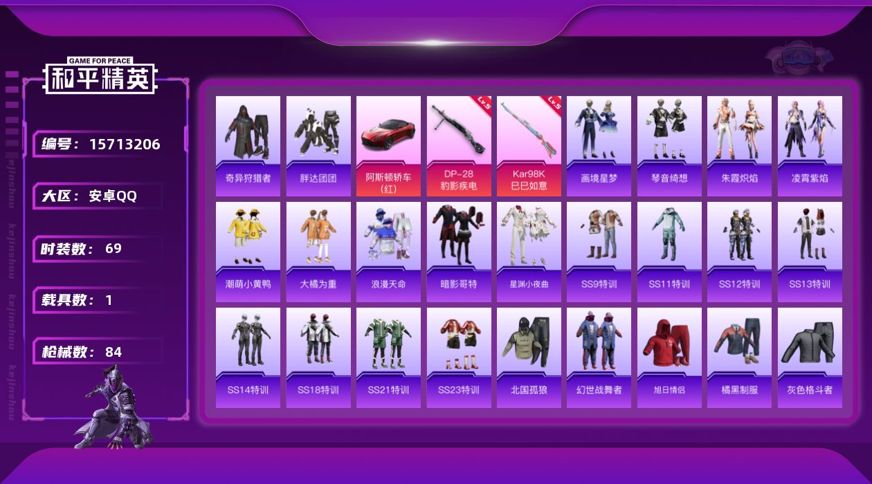 [15713206]安卓 手Q-0粉装-3特效枪-1载具-2粉色飞行器-25848热力值-2王牌印记-69套装-84枪皮【热门品类】:套装-浪漫天命,套装-奇异狩猎者,套装-胖达团团,套装-潮萌小黄鸭,套装-暗影哥特【粉色枪皮等级】:AKS-74U-森灵之息(四级),Kar98K-巳巳如意(五级),DP-28-豹影疾电(五级)【粉色载具】:阿斯顿马丁DBS(红)【粉色枪皮】:AKS-74U-森灵之息,Kar98K-巳巳如意,DP-28-豹影疾电【粉色飞行器】:暮色之舞飞行器