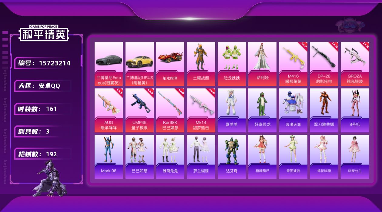 [15723214]安卓 手Q-3粉装-7特效枪-3载具-2粉色飞行器-66509热力值-10王牌印记-161套装-192枪皮【热门品类】:套装-浪漫天命,角色-军刀雅典娜,套装-SS1特训,角色-8号机,角色-Mark.06【粉色套装】:粉装-土曜战麒,粉装-恐龙拽拽,角色-萨利娅【粉色枪皮等级】:M416-暖熊萌萌(七级),GROZA-镜光银凌(五级),AUG-暖羊咩咩(五级),UMP45-量子极限(五级),Kar98K-巳巳如意(五级),Mk14-甜梦熊击(五级),DP-28-豹影疾电(五级)【粉色载具】:兰博基尼Estoque(银翼灰),兰博基尼URUS(明艳黄),焰龙咆哮【粉色枪皮】:M416-暖熊萌萌,GROZA-镜光银凌,AUG-暖羊咩咩,UMP45-量子极限,Kar98K-巳巳如意,Mk14-甜梦熊击,DP-28-豹影疾电【粉色飞行器】:脆鲨七海飞行器,动力核心飞行器