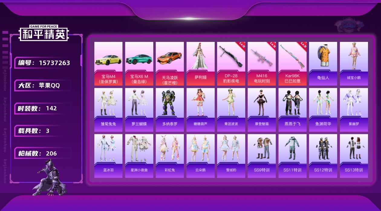 - [13010304]【1463】苹果 手Q-13粉装-5特效枪-4载具-3粉色飞行器-68252热力值-9王牌印记-143套装-200枪皮 【热门品类】:粉装-梦幻火箭,套装-深海小丑鱼,套装-小丑鱼,套装-龟仙人 【粉色载具】:玛莎拉蒂Quattroporte(夜幕蓝),玛莎拉蒂Grecale(薄荷绿),焰龙咆哮,海龙奔腾 【粉色套装】:粉装-梦幻火箭,粉装-新星烈龙,粉装-冰霜白皇,粉装-山涧鹿灵,粉装-天之羽翼,粉装-海盐物语,粉装-橘柚倾心,粉装-赤焰黑爵,粉装-紫电风暴,粉装-碧穹智者,粉装-光明术士,粉装-霞光圣骑,角色-圣堂之誓 【粉色枪皮等级】:AKM-星际浪客(六级),SCAR-L-青春物语(五级),M416-暖熊萌萌(七级),Kar98K-巳巳如意(五级),DP-28-豹影疾电(五级) 【粉色枪皮】:AKM-星际浪客,SCAR-L-青春物语,M416-暖熊萌萌,Kar98K-巳巳如意,DP-28-豹影疾电 【粉色飞行器】:梦幻火箭飞行器,天之羽翼飞行器,星际浪客飞行器 【粉色降落伞】:春暖花开降落伞,梦幻火箭降落伞,童趣迷兔降落伞,暗夜玫瑰降落伞,天之羽翼降落伞,碧影闪光降落伞,青春物语降落伞,冷魅冰骑降落伞,炙焰牛王降落伞,暖熊萌萌降落伞,翩跹演武降落伞,星际浪客降落伞,炫光之旅降落伞,圣堂之誓降落伞,冷漠罗丽降落伞 【稀有套装】:套装-龟仙人,套装-巳巳如意,套装-燕燕于飞,套装-鱼渊荷华,角色-海琴烟,套装-紫幽梦,套装-蓝冰羽,套装-星影赞美诗,套装-朱霞炽焰,套装-凌霄紫焰 【稀有枪皮】:AKM-2P战斗服款,AKM-冰凉西瓜,AKM-彩虹符号,AKM-灼热熔岩,AKM-破晓战魂,AKM-萌趣颜团子,AKM-虎虎生威,AKM-霓虹街区,AKM-龙的传人,M16A4-幻世战舞者,M16A4-甜心亚梦,M16A4-红色方程式,SCAR-L-夜灯,SCAR-L-炫彩节奏,SCAR-L-玉兔迎春,SCAR-L-红色方程式,SCAR-L-青丘仙客,M416-糯团青竹,M416-红色方程式,M416-绯红前夜,M416-蓝色火焰,GROZA-异彩先驱,GROZA-彩虹符号,GROZA-懵萌河马,GROZA-田园牧歌,AUG-幻梦音符,AUG-耀粉歌者,AUG-青春冒险家,QBZ-彩虹符号,QBZ-赛罗,QBZ-飞驰魅影,M762-天降萌叽,M762-暗夜鎏金,M76