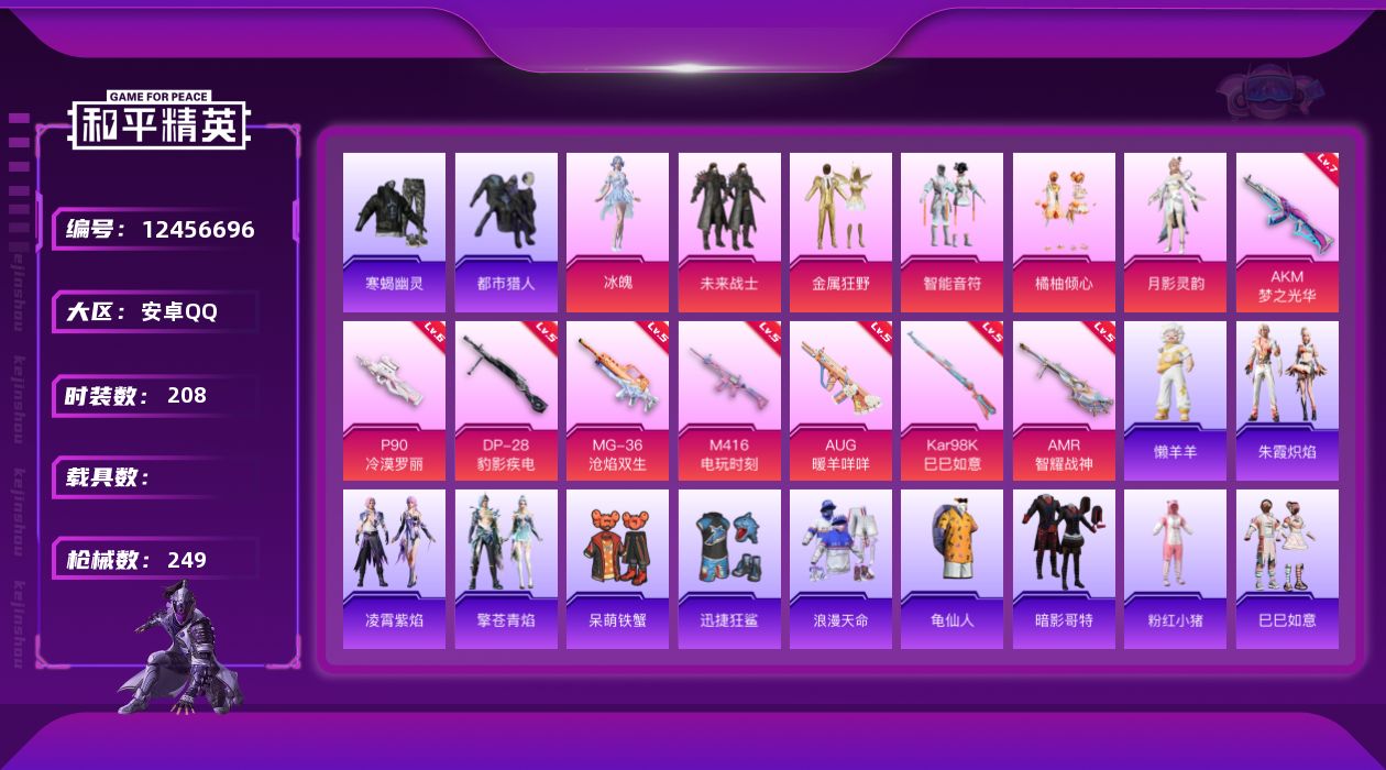[12456696]【822】安卓 手Q-6粉装-8特效枪-0载具-0粉色飞行器-74883热力值-11王牌印记-208套装-249枪皮