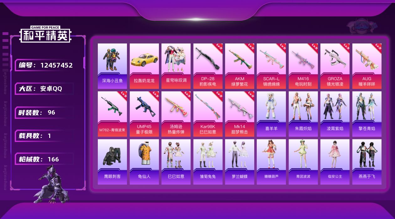 [12457452]【824】安卓 手Q-1粉装-11特效枪-1载具-0粉色飞行器-45634热力值-10王牌印记-96套装-166枪皮