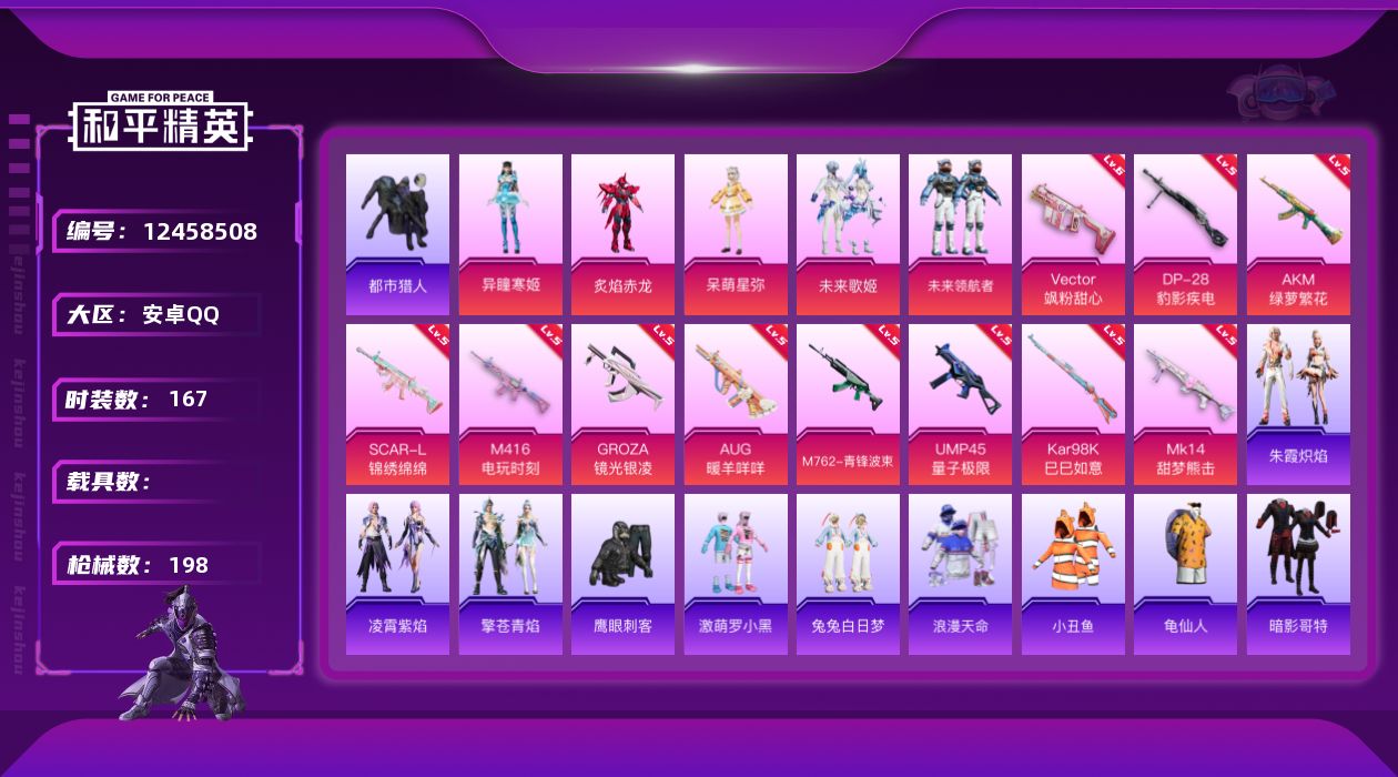 [12458508]【826】安卓 手Q-5粉装-11特效枪-0载具-0粉色飞行器-58586热力值-14王牌印记-167套装-198枪皮