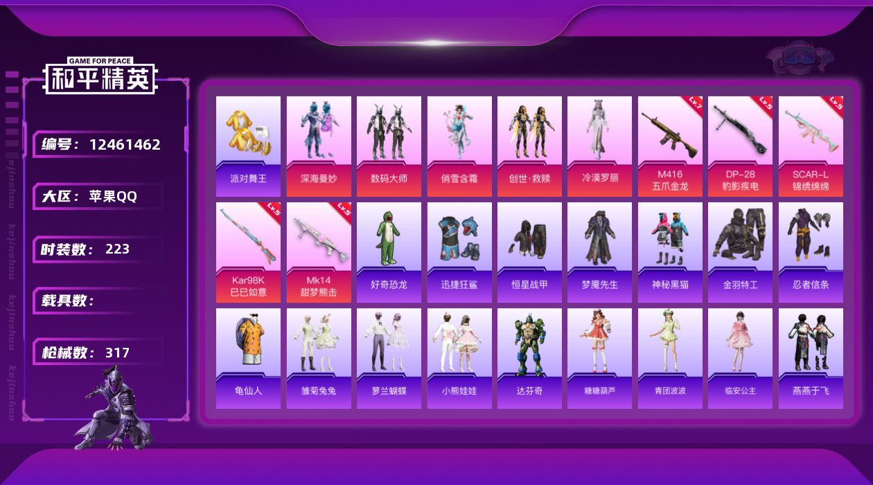 [12461462]【839】苹果 手Q-5粉装-5特效枪-0载具-3粉色飞行器-90974热力值-10王牌印记-223套装-317枪皮 【热门品类】:套装-派对舞王,套装-金羽特工,套装-忍者信条,套装-龟仙人,小恶魔头饰 【粉色套装】:粉装-深海曼妙,粉装-数码大师,粉装-俏雪含霜,套装-创世·救赎,角色-冷漠罗丽 【粉色枪皮等级】:SCAR-L-锦绣绵绵(五级),M416-五爪金龙(七级),Kar98K-巳巳如意(五级),Mk14-甜梦熊击(五级),DP-28-豹影疾电(五级) 【粉色枪皮】:SCAR-L-锦绣绵绵,M416-五爪金龙,Kar98K-巳巳如意,Mk14-甜梦熊击,DP-28-豹影疾电 【粉色飞行器】:梦幻火箭飞行器,齐天大圣飞行器 【粉色降落伞】:百万伏特降落伞,春暖花开降落伞,神秘黑猫降落伞,古堡领主降落伞,繁花小夜曲降落伞,四圣焕新降落伞,银刃赛罗降落伞,香水柠檬降落伞,暗夜玫瑰降落伞,洛神天依降落伞,天星战神降落伞,圣堂之誓降落伞,初号机 觉醒Ver.降落伞,鬼刀降落伞,星穹咏叹调降落伞 【稀有套装】:套装-龟仙人,套装-雏菊兔兔,套装-萝兰蝴蝶,套装-小熊娃娃,角色-达芬奇,套装-糖糖葫芦,套装-青团波波,角色-临安公主,套装-燕燕于飞,套装-鱼渊荷华,套装-闪电轻猫,套装-粉恋花,套装-紫幽梦,套装-蓝冰羽,套装-星渊小夜曲,套装-云朵鹅,套装-雪绒豹,角色-夜瞳黯灵 【稀有枪皮】:AKM-冰凉西瓜,AKM-夜灯,AKM-春暖花开,AKM-江南烟雨,AKM-破晓战魂,AKM-虎虎生威,AKM-霓虹街区,AKM-龙的传人,M16A4-幻世战舞者,M16A4-机械英豪,M16A4-红色方程式,M16A4-蓝色火焰,M16A4-魔法学院,SCAR-L-夜灯,SCAR-L-暗夜玫瑰,SCAR-L-玉兔迎春,SCAR-L-繁花小夜曲,SCAR-L-红色方程式,SCAR-L-致命红樱,SCAR-L-雷霆特警,SCAR-L-黄金龙骨,M416-滑板小狐,M416-糯团青竹,M416-红色方程式,M416-绯红前夜,M416-蓝色火焰,GROZA-异彩先驱,GROZA-治愈之星,GROZA-生命誓言,GROZA-田园牧歌,GROZA-黑色刀锋,AUG-甜蜜菠萝,AUG-耀粉歌者,AUG-青春冒险家,QBZ-原初圣火,QBZ-彩虹符号,QBZ-神秘黑猫,QBZ-诡娃娃,