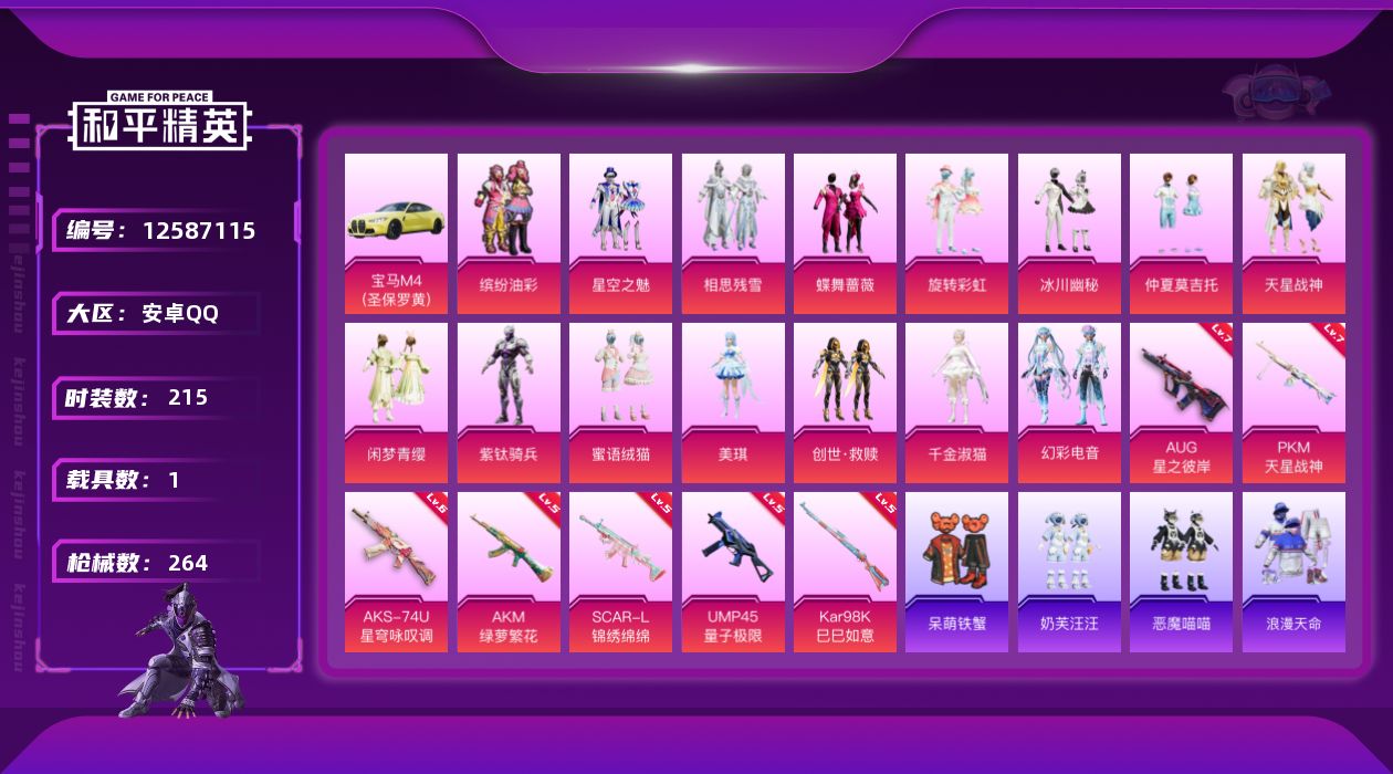 [12587115]【959】安卓 手Q-15粉装-7特效枪-1载具-5粉色飞行器-88150热力值-15王牌印记-215套装-264枪皮 【热门品类】:粉装-缤纷油彩,套装-浪漫天命,角色-军刀雅典娜,套装-龟仙人,套装-糯粉咩咩,角色-Mark.06 【粉色载具】:宝马M4(圣保罗黄) 【粉色套装】:粉装-缤纷油彩,粉装-星空之魅,粉装-相思残雪,粉装-蝶舞蔷薇,粉装-旋转彩虹,粉装-冰川幽秘,粉装-仲夏莫吉托,粉装-天星战神,粉装-闲梦青缨,角色-紫钛骑兵,粉装-蜜语绒猫,角色-美琪,套装-创世·救赎,角色-千金淑猫,粉装-幻彩电音 【粉色枪皮等级】:AKM-绿萝繁花(五级),SCAR-L-锦绣绵绵(五级),AUG-星之彼岸(七级),UMP45-量子极限(五级),AKS-74U-星穹咏叹调(六级),Kar98K-巳巳如意(五级),PKM-天星战神(七级) 【粉色枪皮】:AKM-绿萝繁花,SCAR-L-锦绣绵绵,AUG-星之彼岸,UMP45-量子极限,AKS-74U-星穹咏叹调,Kar98K-巳巳如意,PKM-天星战神 【粉色飞行器】:歌者泠鸢飞行器,龙翔九天飞行器,冠军兔兔飞行器,月下星之子飞行器,星月云朵飞行器 【粉色降落伞】:星之彼岸降落伞,碧影闪光降落伞,暖熊萌萌降落伞,垂柳戏鸭降落伞,彩虹甜喵降落伞,旋转彩虹降落伞,冰川粉黛降落伞,暗夜鎏金降落伞,第五大道降落伞,南国舞曲降落伞,天星战神降落伞,未来歌姬降落伞,炫光之旅降落伞,超新星降落伞,万古烈焰降落伞,莲影清波降落伞,繁龙极客降落伞,精灵梦叶罗丽降落伞,金丰海韵降落伞,精灵之光降落伞,千金淑猫降落伞,幻影飞狐降落伞,彩虹独角兽降落伞,樱桃泡泡降落伞,星穹咏叹调降落伞,幻星舰长降落伞,冷漠罗丽降落伞,荧海星豚降落伞 【稀有套装】:套装-龟仙人,套装-绒宝小鹅,套装-巳巳如意,套装-小鸟芋圆,套装-雏菊兔兔,套装-萝兰蝴蝶,套装-小熊娃娃,角色-狂花道·娜可露露,套装-糖糖葫芦,套装-青团波波,套装-棉花软糖,角色-摩登魅猫,角色-许七安,套装-燕燕于飞,套装-鱼渊荷华,角色-风玲,套装-晶辉守护,套装-白辉玉蕊,套装-雪夜云雾,套装-粉恋花,套装-紫幽梦,套装-蓝冰羽,角色-瑰梦爱神,套装-星影赞美诗,套装-云朵鹅,套装-雪绒豹 【稀有枪皮】:AKM-彩虹符号,AKM-春暖花开,AKM-灼热熔岩,AKM-破晓战魂,AK