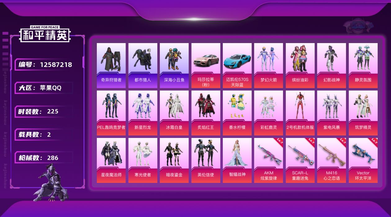 - [15080202]素材身法号/无敌战神框1 苹果 微信-无敌战神框-5粉装-9特效枪-1载具-4粉色飞行器-3.2w热力值-5王牌印记-56套装-89枪皮【热门品类】:粉装-怪诞乔克,套装-胖达团团,套装-天网终结者,小丑红鼻头,师父专用外套【粉色载具】:冰绡玉鳞【粉色套装】:粉装-极限特训,粉装-星际漫游者,粉装-怪诞乔克,粉装-冰霜白皇,角色-零号机款机体服【粉色枪皮等级】:SCAR-L-魔童闹海 哪吒(六级),M416-风花雪月(六级),GROZA-焦糖拿铁(二级),AUG-星之彼岸(四级),Vector-最终圣卫者(三级),P90-魔童闹海 敖丙(三级),Mk14-甜梦熊击(五级),DP-28-豹影疾电(五级)【粉色飞行器】:终晖之翼飞行器,灵珠游龙飞行器