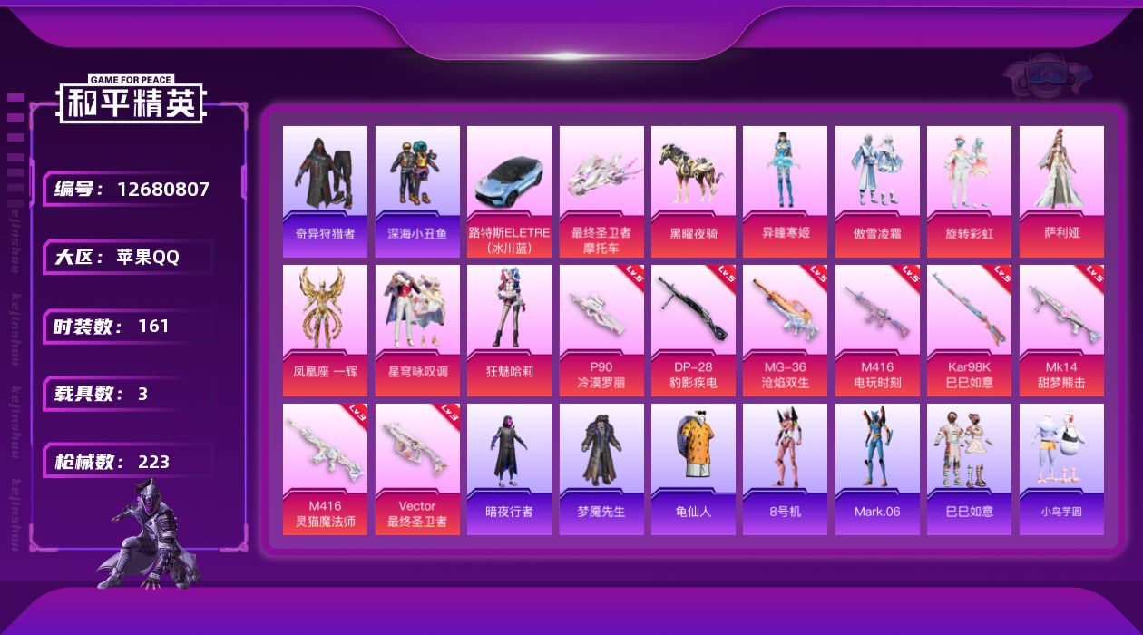 [12680807]【1127】苹果 手Q-7粉装-8特效枪-3载具-3粉色飞行器-69572热力值-7王牌印记-161套装-223枪皮 【热门品类】:套装-深海小丑鱼,套装-奇异狩猎者,套装-暗夜行者,套装-龟仙人,角色-8号机,角色-Mark.06 【粉色载具】:路特斯ELETRE(冰川蓝),最终圣卫者摩托车,黑曜夜骑 【粉色套装】:粉装-傲雪凌霜,粉装-旋转彩虹,角色-萨利娅,角色-凤凰座 一辉,粉装-星穹咏叹调,角色-狂魅哈莉,角色-异瞳寒姬 【粉色枪皮等级】:M416-电玩时刻(五级),M416-灵猫魔法师(三级),Vector-最终圣卫者(三级),P90-冷漠罗丽(六级),Kar98K-巳巳如意(五级),Mk14-甜梦熊击(五级),DP-28-豹影疾电(五级),MG-36-沧焰双生(五级) 【粉色枪皮】:M416-电玩时刻,M416-灵猫魔法师,Vector-最终圣卫者,P90-冷漠罗丽,Kar98K-巳巳如意,Mk14-甜梦熊击,DP-28-豹影疾电,MG-36-沧焰双生 【粉色飞行器】:荒漠赏金飞行翼,终晖之翼飞行器,灵猫魔法师飞行器 【粉色降落伞】:筑梦精灵降落伞,荒漠赏金降落伞,环太平洋降落伞,千面幻镜降落伞,BEARBRICK降落伞,未来领航者降落伞,千金淑猫降落伞,圣域龙灵降落伞,智耀战神降落伞,星穹咏叹调降落伞,双重狂想降落伞,最终圣卫者降落伞,冷漠罗丽降落伞,灵猫魔法师降落伞 【稀有套装】:套装-龟仙人,套装-巳巳如意,套装-小鸟芋圆,套装-雏菊兔兔,套装-萝兰蝴蝶,套装-小熊娃娃,角色-多纳泰罗,套装-糖糖葫芦,套装-青团波波,角色-摩登魅猫,套装-燕燕于飞,套装-鱼渊荷华,套装-樱梦幻音,套装-粉恋花,套装-紫幽梦,套装-蓝冰羽,角色-猎影月神,角色-瑰梦爱神,套装-星影赞美诗,套装-极速光影,套装-彩虹兔,套装-云朵鹅,套装-雪绒豹,套装-诡诞巡游 【稀有枪皮】:AKM-彩虹符号,AKM-环太平洋,AKM-破晓战魂,AKM-龙的传人,AKM-灵猫魔法师,M16A4-幻世战舞者,M16A4-甜心亚梦,M16A4-红色方程式,M16A4-蓝色火焰,M16A4-最终圣卫者,SCAR-L-夜灯,SCAR-L-炫彩节奏,SCAR-L-玉兔迎春,SCAR-L-红色方程式,SCAR-L-冷漠罗丽,M416-暗夜行者,M416-月影鸳鸯,M416-糯团青竹,M416